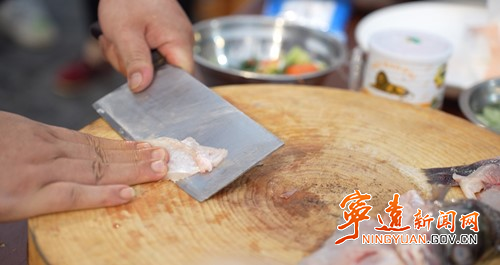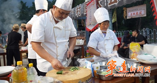 主持人忙碌地穿梭于各支队伍的灶台间,讲述着每一道菜品背后的故事与灵感。只见荆大私房菜队的厨师手法娴熟,将鱼去鳞、去内脏、切成薄片,随后鱼片被轻轻滑入滚热的油锅中,伴随着“嗞啦”一声,油花迅速渗透并紧紧包裹住每一片鱼肉,香气四溢。另一边的天阳队,他们的厨师则展示出了另一种风格。他手中的面团在案板上翻飞,不一会儿,一个精致的花卷就成型了。各支队伍各显神通,处理食材、精心烹饪,不到一个小时,各式菜品就出现在嘉宾评委和大众评委席上,勾起了大家的食欲。“今天参加村厨大赛活动,感受到这种氛围,吃到了宁远的美食,还带动宁远的旅游,抽了奖,然后还买到宁远的特产,包括九嶷山兔等等很多美食,这种氛围可以带动我们所有宁远的旅游,包括5A景区创建,非常好,我们宁远也非常好玩,有好吃的好玩的,欢迎大家来参与。”大众评委张春荣开心地说道。