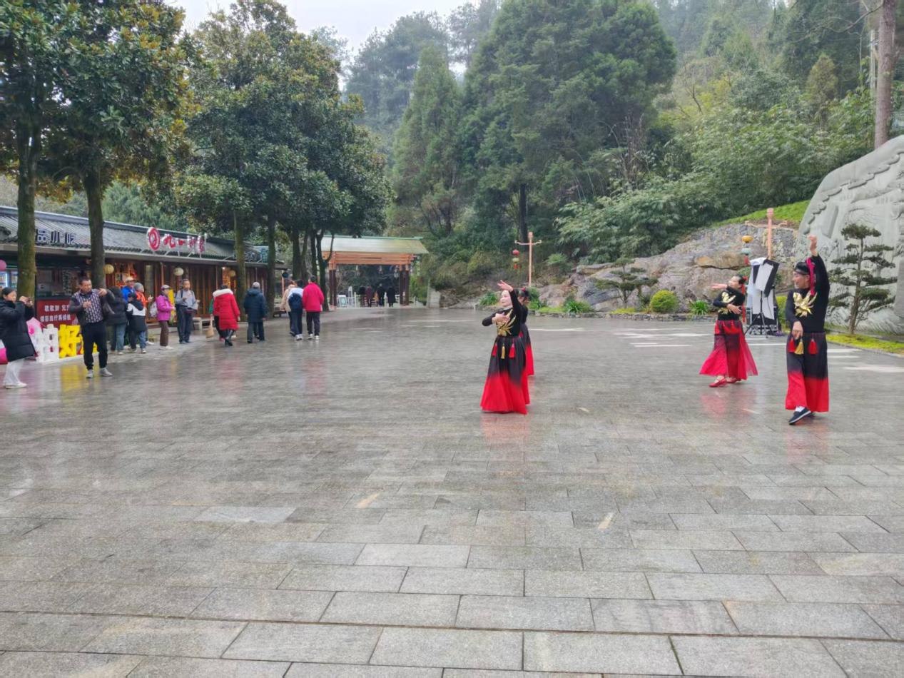 演出期间,志愿者队伍以群众喜闻乐见的形式,献上古韵歌舞、传统戏曲、器乐演奏、民俗小品、小戏及互动节目等多元内容,并与景区溶洞实景演艺《二妃寻夫》同步联动,将舜帝文化、瑶族风情与新春祝福融入表演。演出设在紫霞岩入口处,游客一进入便可免费观看。演员们热情饱满、技艺娴熟,精彩节目轮番上演,引得游客频频驻足、掌声不断,大家纷纷用手机记录美好瞬间,沉浸式感受宁远文化魅力。