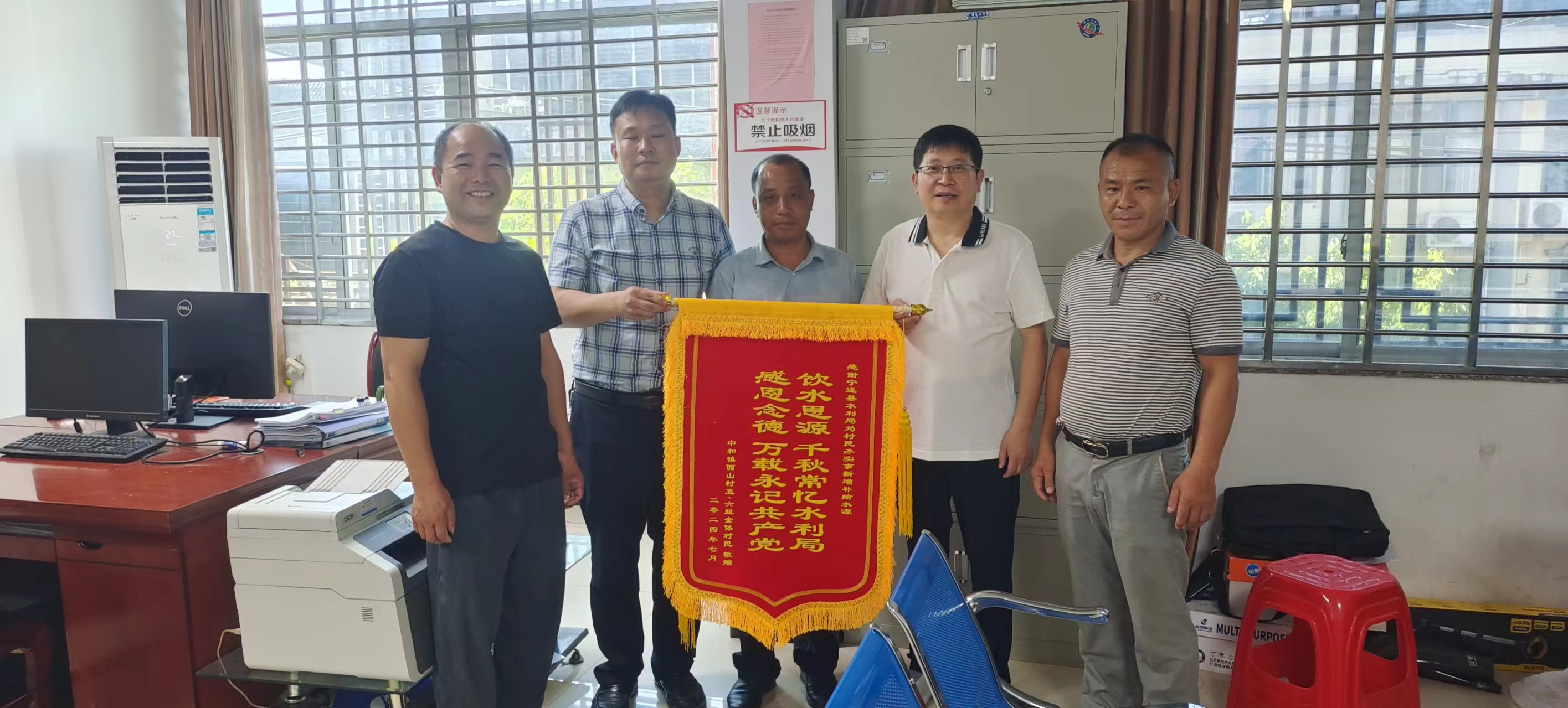 7月8日一大早,宁远县中和镇西山村村民代表将一面印有“饮水思源千秋常忆水利局,感恩念德万载永记共产党”的锦旗送到县水利局办公室,金烫的几个大字熠熠生辉,格外耀眼,镌刻着浓浓的感恩之情,这是县水利局为村民办实事带来的喜人一幕。