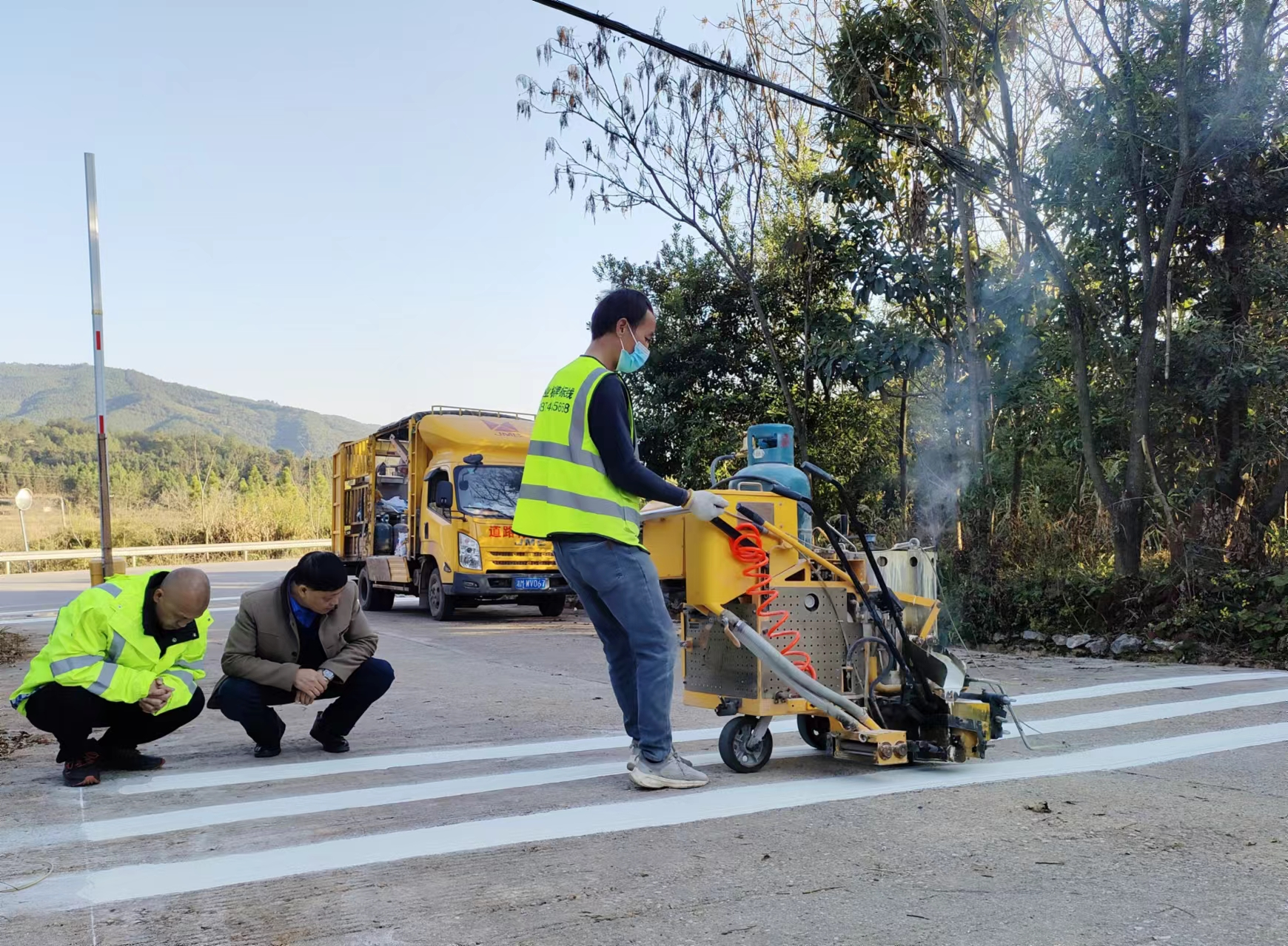 1月14日,湖南省永州市宁远县S572宁中公路沿线,公路养护工人正忙碌着,在平交路口、急弯及学校路段摆放施工警示牌,清扫道路,对照标识底线,推着划线机平缓驶过路面,一条条崭新的交通标线呈现在眼前,宁远县交通运输局相关责任人则在现场进行技术指导。