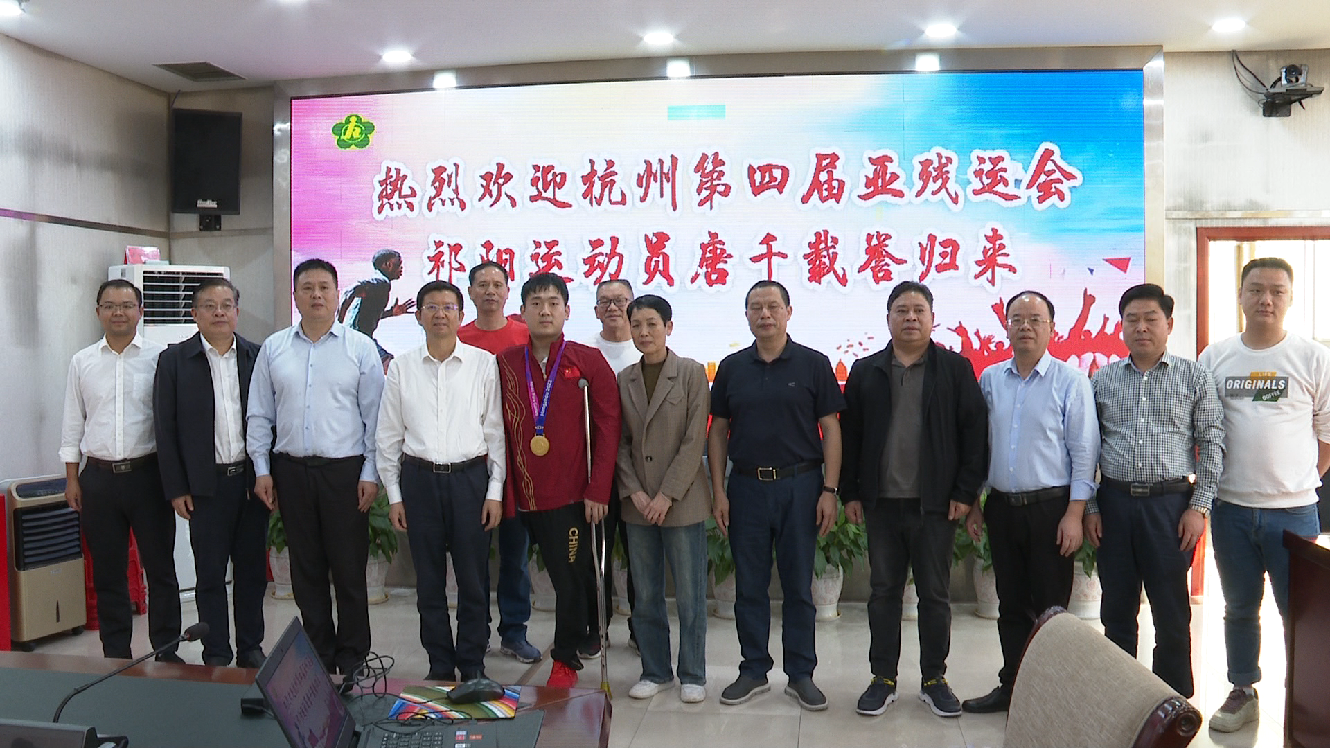 11月1日,祁阳市举行仪式欢迎亚残运会冠军唐千载誉归来。永州市政协副主席、祁阳市委书记蒋良铁出席并讲话,祁阳市委副书记、统战部长廖劲松主持仪式,祁阳市领导郑国荣、彭国锋、周贞霖、周海平参加。