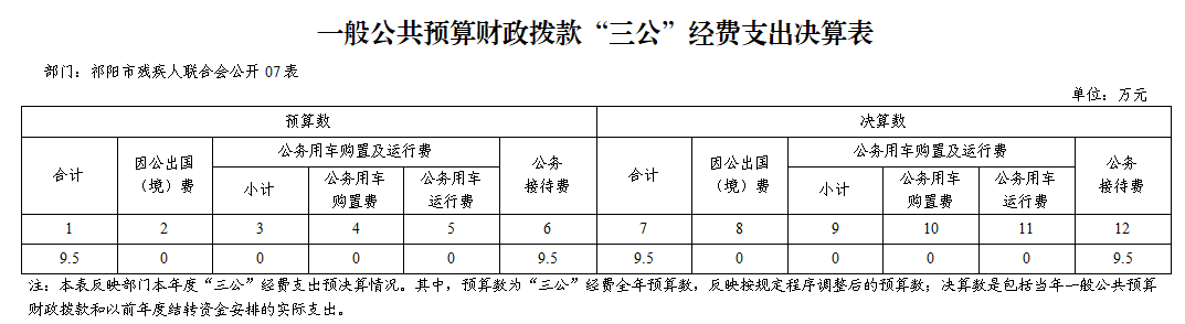 “三公”经费财政拨款支出预算为9.5万元,支出决算为9.5万元,完成预算的100%,其中: