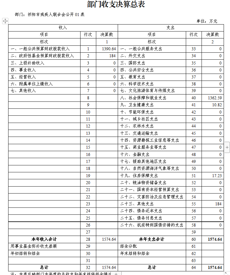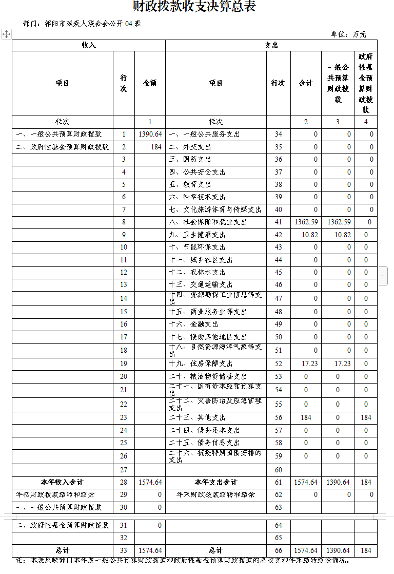 2020年度收、支总计1574.64万元。其中收入:一般公共预算财政拨款收入1390.64万,政府性基金预算拨款收入184万。支出:社会保障和就业支出1362.59万,卫生健康支出10.82万,住房保障支出17.23万,其他支出184万。