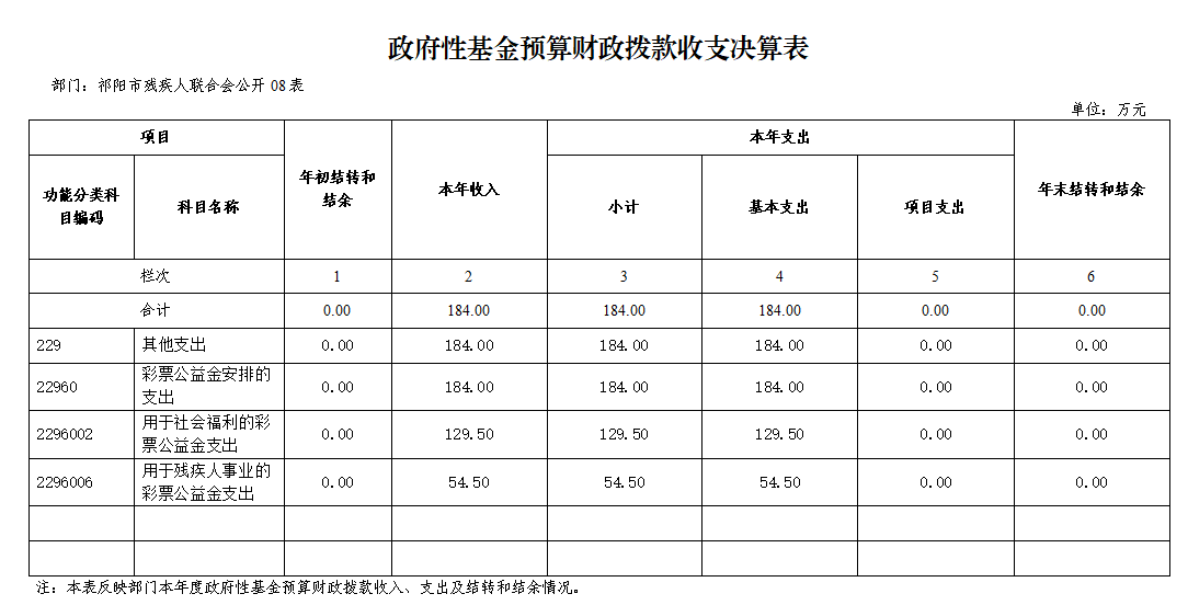 2020年度政府性基金预算财政拨款收入184万元;年初结转和结余0万元;支出184万元,其中基本支出184万元,项目支出0万元;年末结转和结余0万元。