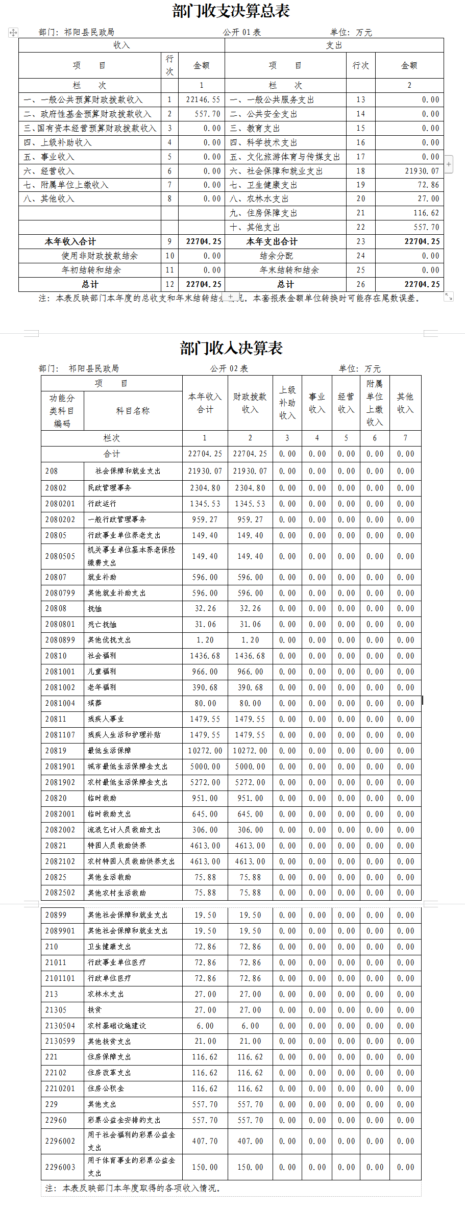 1.预算编制情况。严格按照预算管理的相关规定和部门预算编制要求, 科学合理编制了预算,按时完成了2020年预算编制工作。2020年祁阳县民政局预算总额是22704.25万元,其中:当年财政拨款收入22704.25万元,事业单位经营收入0万元。相应安排支出预算22704.25万元,其中基本支出21744.98万元,项目支出959.27万元。