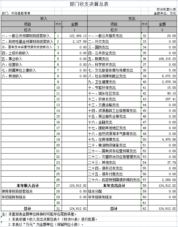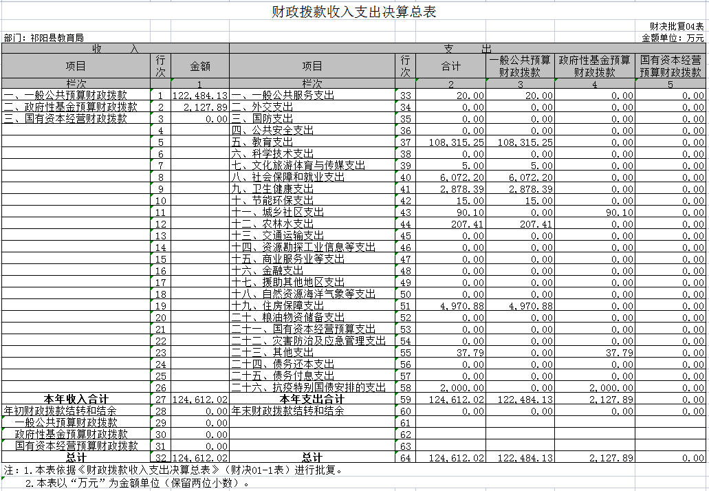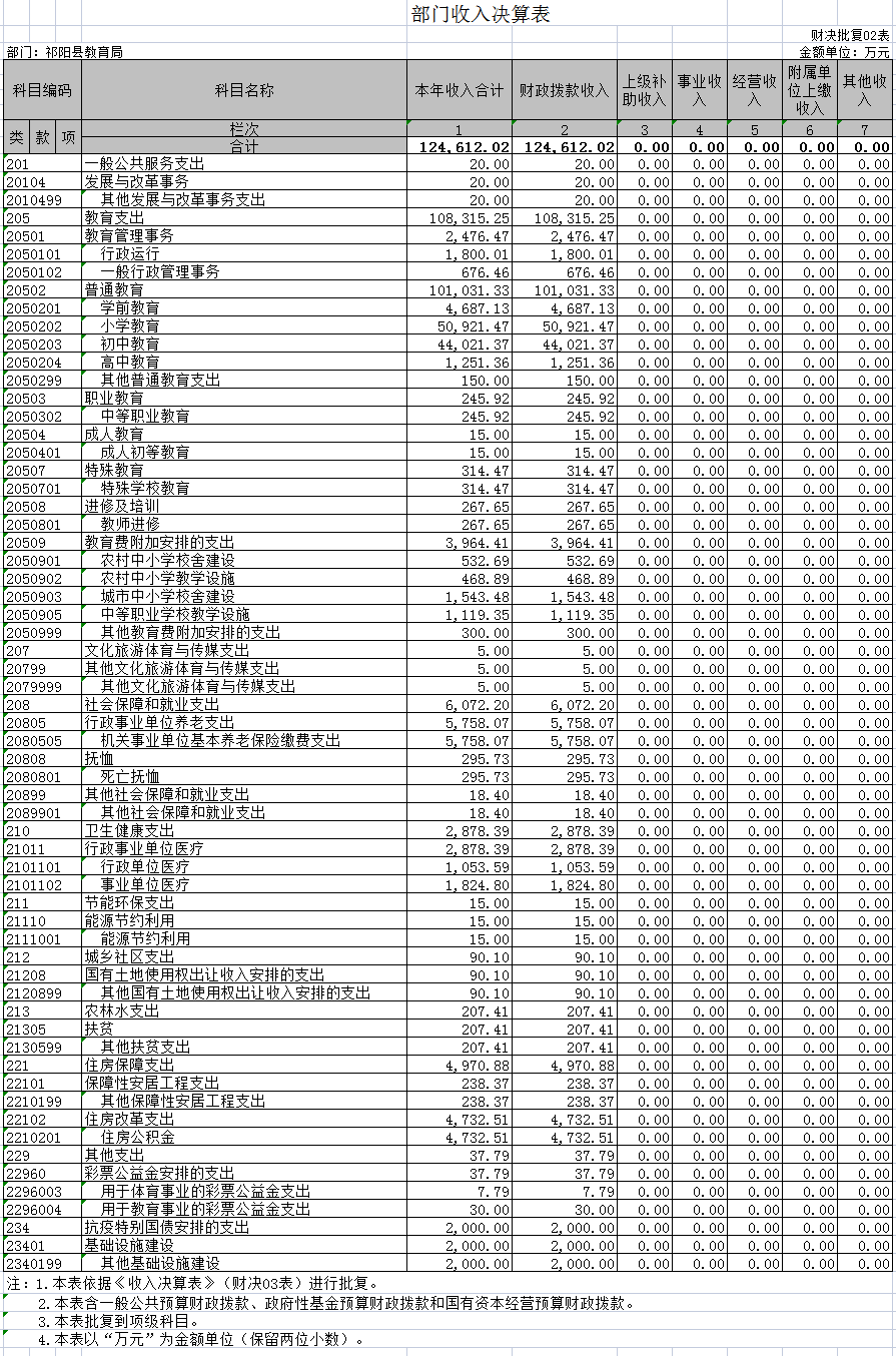本年度收入总计124,612.02 万元,其中:财政拨款收入 124,612.02万元,占100 %;上级补助收入0万元,占0%;事业收入0万元,占0%;经营收入0万元,占0%;附属单位上缴收入0万元,占0%;其他收入0万元,占0%。此收入为祁阳县教育局本级及26个二级预算单位当年拨付的财政资金。