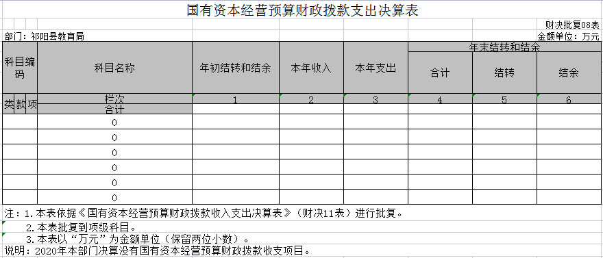 2020年度国有资本经营预算财政拨款收入0万元;年初结转和结余0万元;支出0万元,年末结转和结余0万元。
