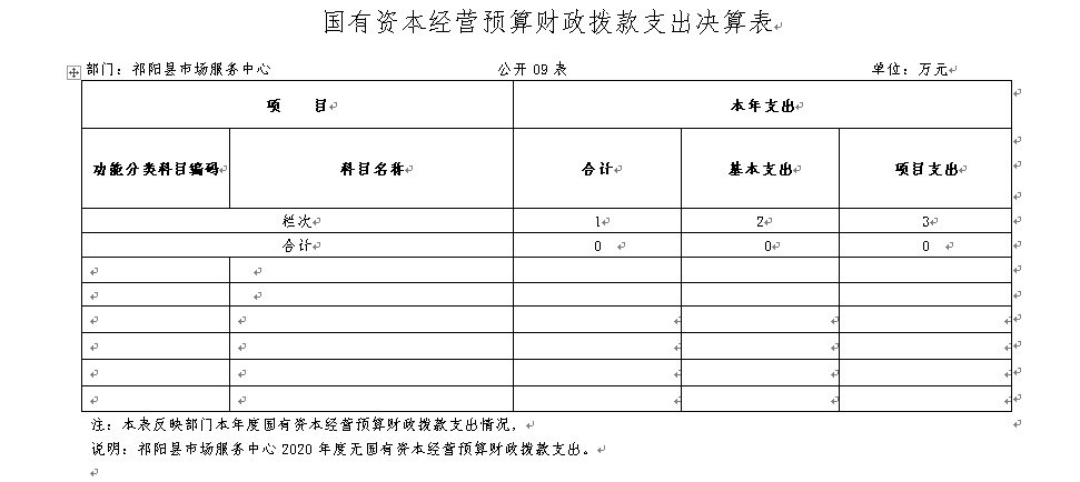 2020年度国有资本经营预算财政拨款收入0万元;年初结转和结余0万元;支出0万元,其中基本支出0万元,项目支出0万元;年末结转和结余0万元。