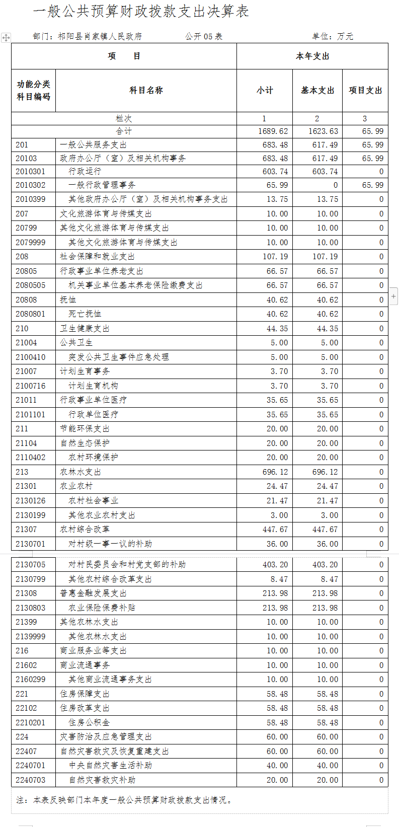 2020年度财政拨款支出1689.62万元,主要用于以下方面:农林水(类)支出696.12万元,占41.20%;一般公共服务(类)支出683.48万元,占40.45%;社会保障和就业(类)支出107.19万元,占6.34%;灾害防治及应急管理(类)支出60万元,占3.55%;住房保障(类)支出58.48万元,占3.46%;卫生健康(类)支出44.35万元,占2.62%;节能环保(类)支出20万元,占1.18%;商业服务业(类)支出10万元,占0.60%;文化旅游体育与传媒支出10万元,占0.60%。