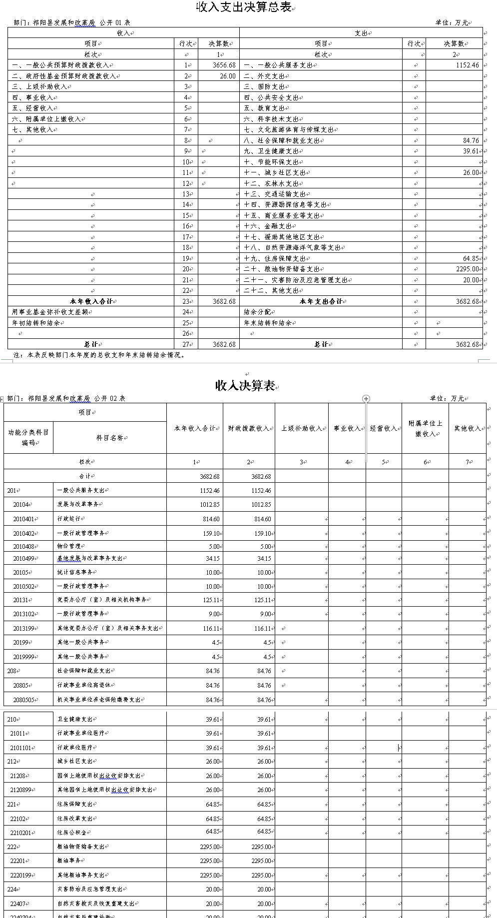2020年收、支总计3682.68万元,与2019年相比,增加989.68万元,增长36.75%,主要是因机构改革原粮食局划入其工资、公积金、医保、项目资金等增加。
