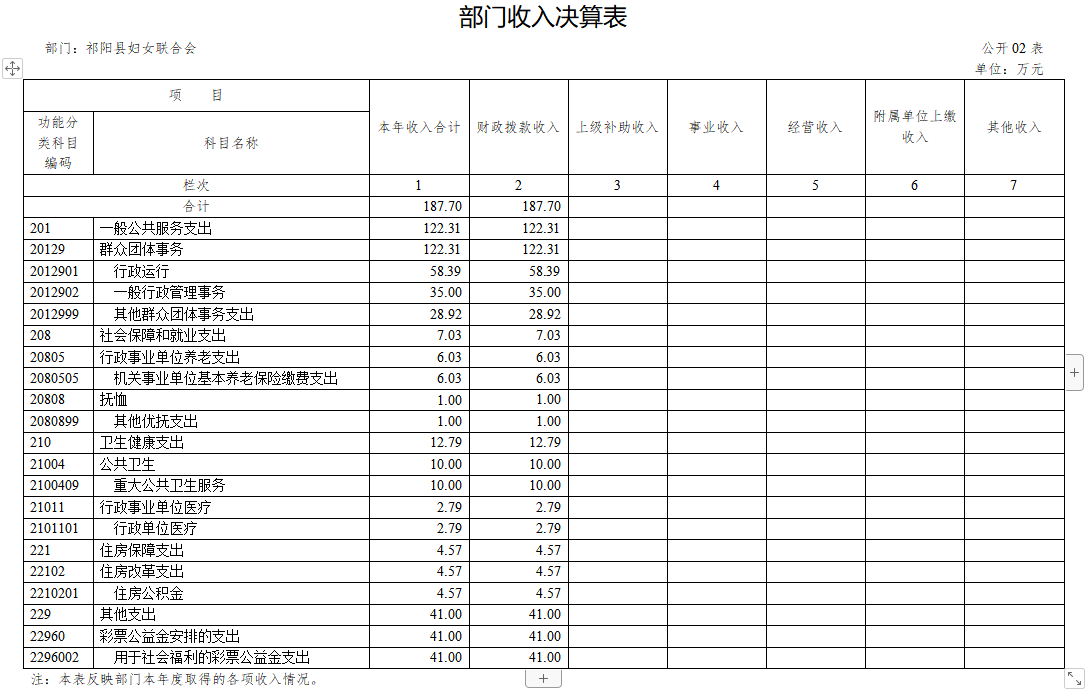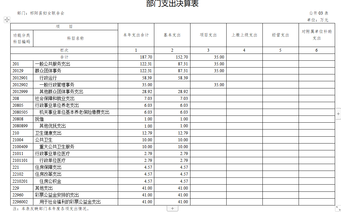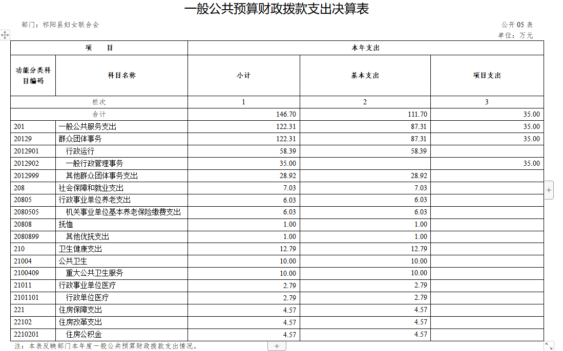 1、一般公共服务支出(201)群众团体事务(20129)行政运行(2012901)、一般行政管理事务(2012902)、其他群众团体事务支出(2012999)。