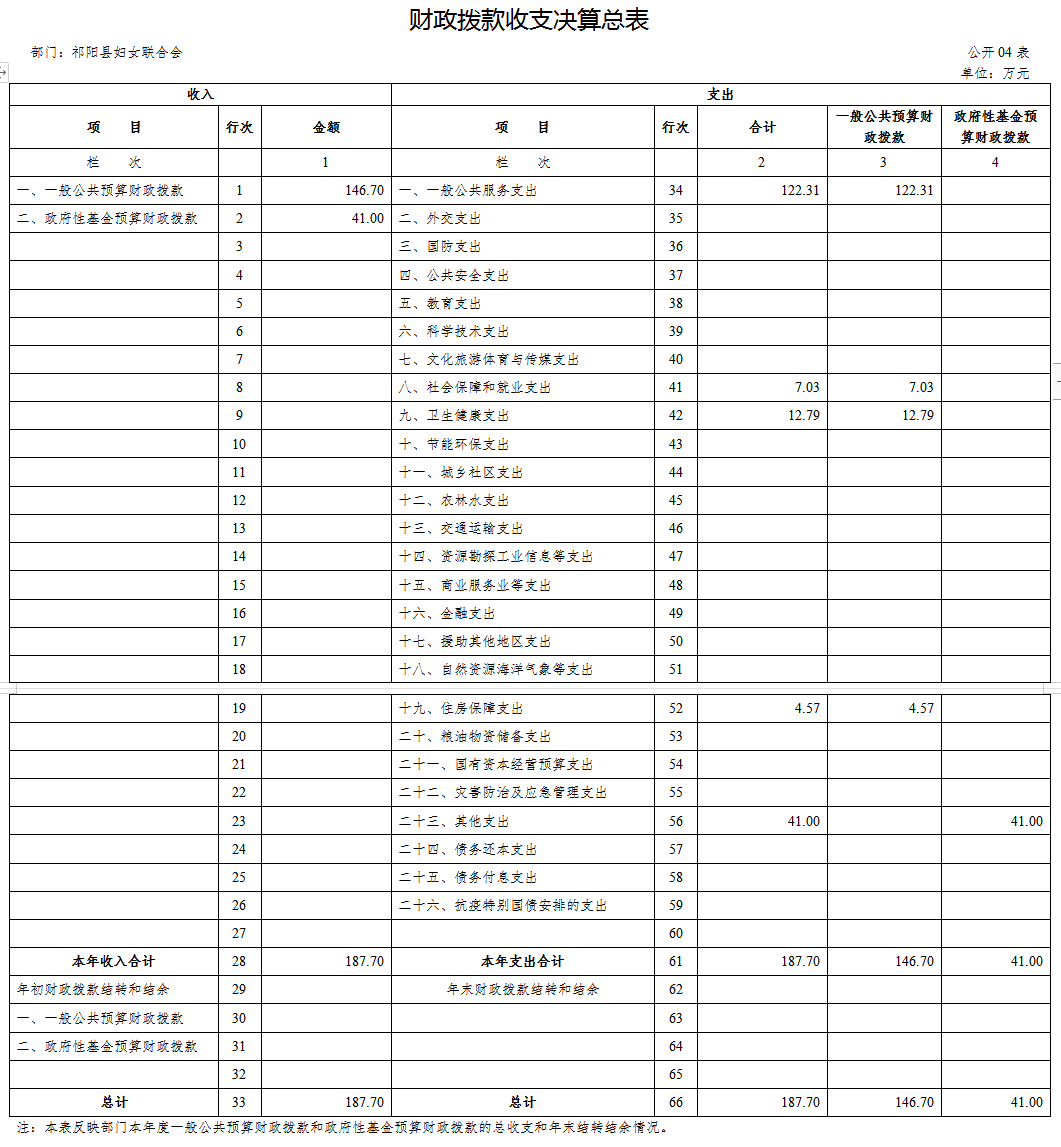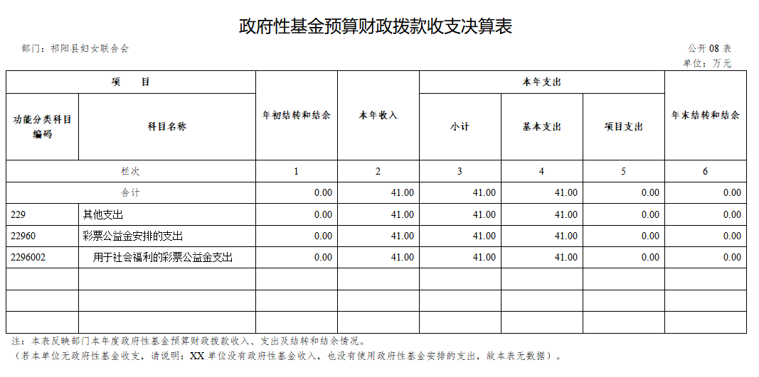 2020年度政府性基金预算财政拨款收入41万元;年初结转和结余0万元;支出41万元,其中基本支出41万元,项目支出0万元;年末结转和结余0万元。
