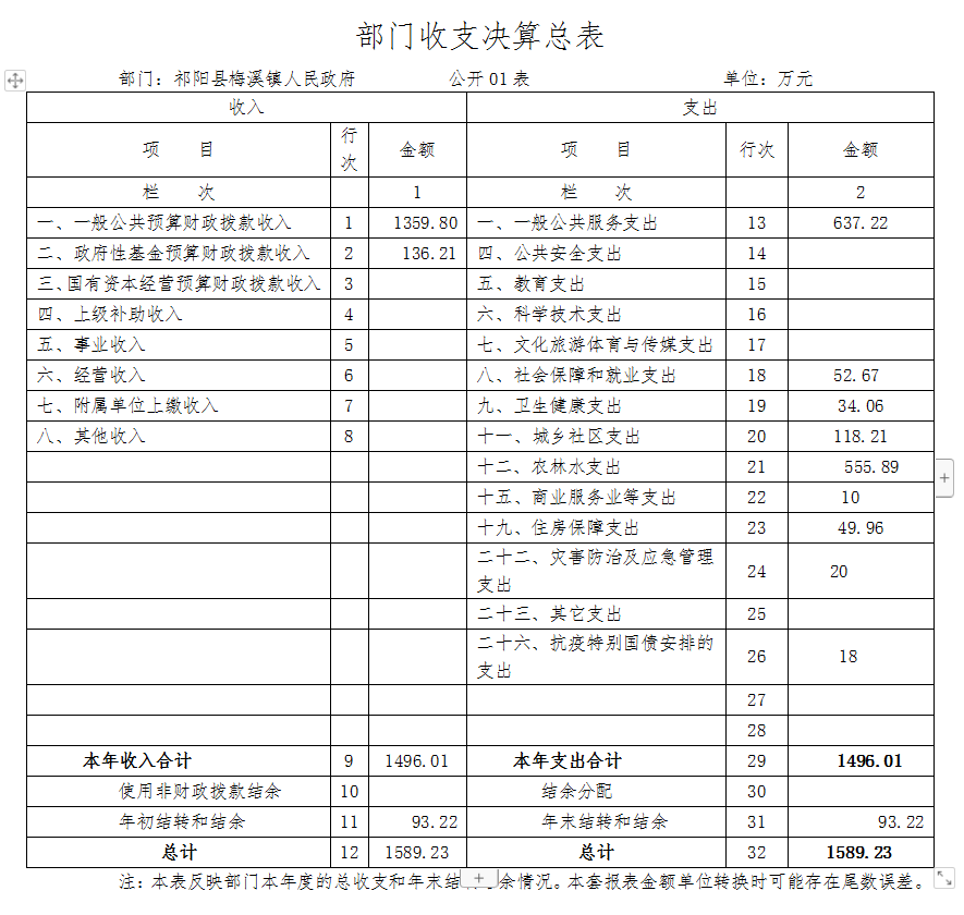 2020年度收、支总计1589.23万元,其中本年收入1496.01万元.上年结余93.22万元,本年支出1496.01万元.结转下年结余93.22万元,与上年度相比,总资金增加了293.01万元,增加了24.36%,主要原因是增加了人员经费(七站八所的并入)、城乡社区支出及抗疫支出。