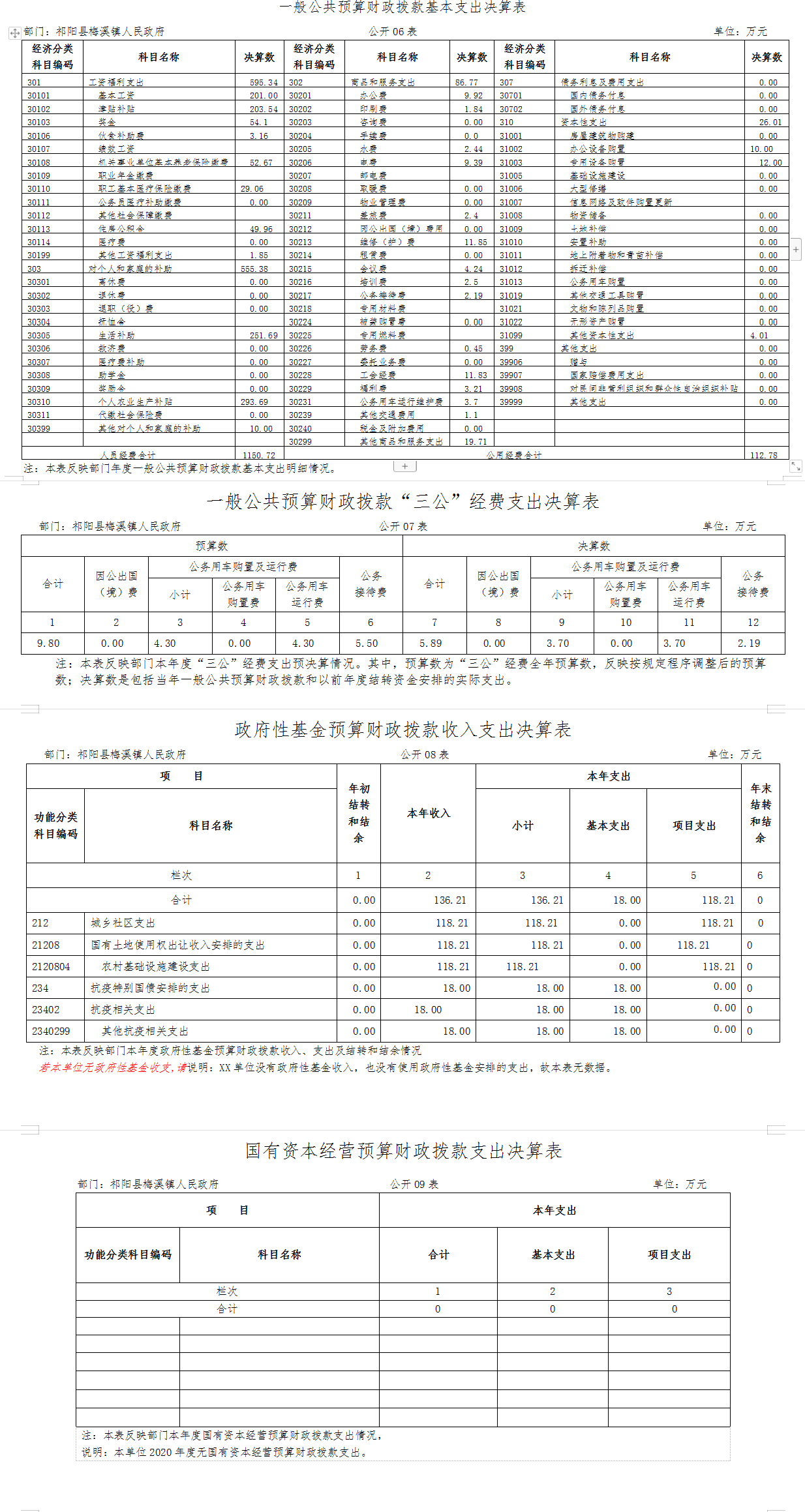 2020年度政府性基金预算财政拨款收入136.21万元;年初结转和结余0万元;支出136.21万元,其中基本支出18.00万元,项目支出118.21万元;年末结转和结余0万元。