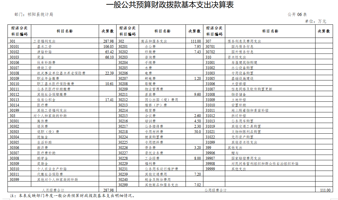 2020年度财政拨款基本支出398.98万元,其中:人员经费287.98万元,占基本支出的72.18%,主要包括基本工资、津贴补贴、奖金、机关事业单位基本养老保险费、职工基本医疗保险缴费、住房公积金等;公用经费111万元,占基本支出的27.82%,主要包括办公费、印刷费、差旅费、专用材料费、工会经费、其他商品和服务支出等。