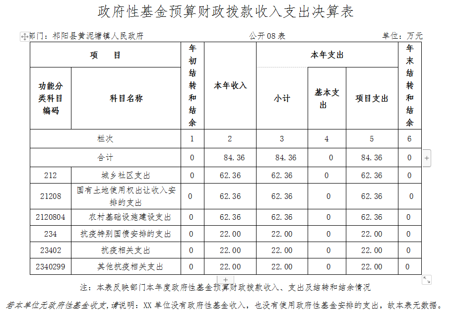 2020年度政府性基金预算财政拨款收入84.36万元;年初结转和结余0万元;支出84.36万元,其中基本支出0万元,项目支出84.36万元;年末结转和结余0万元。