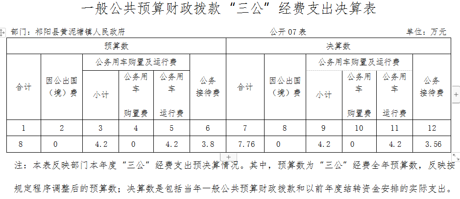 2020年度“三公”经费财政拨款支出决算中,公务接待费支出决算3.56元,占45.88%,因公出国(境)费支出决算0万元,占0%,公务用车购置费及运行维护费支出决算4.2万元,占54.12%,其中: