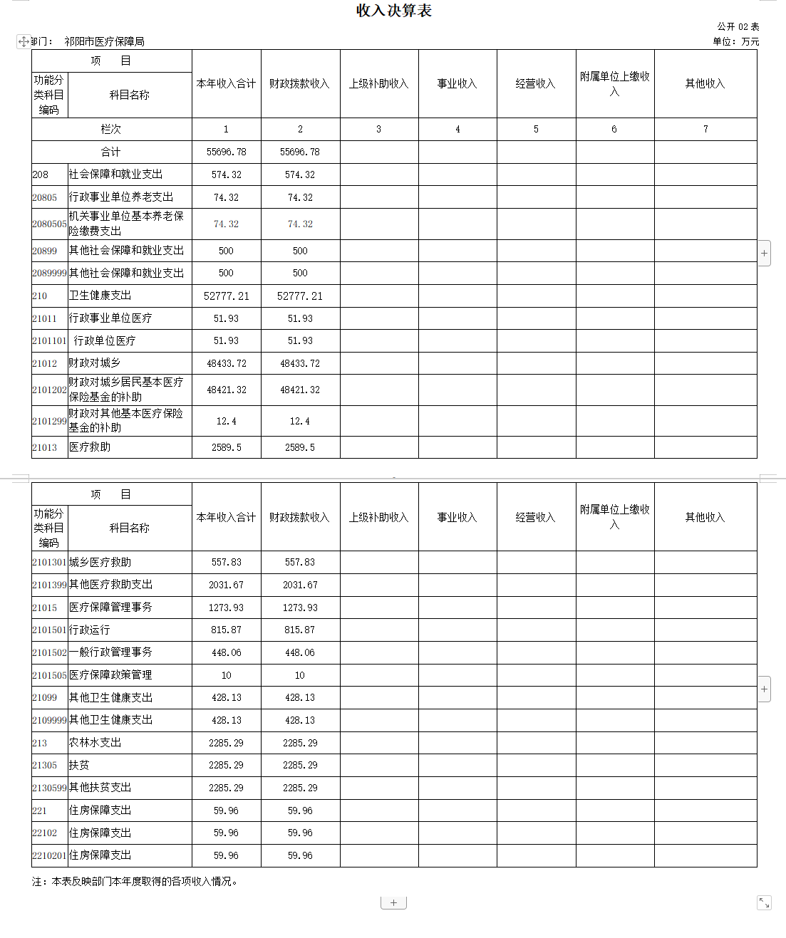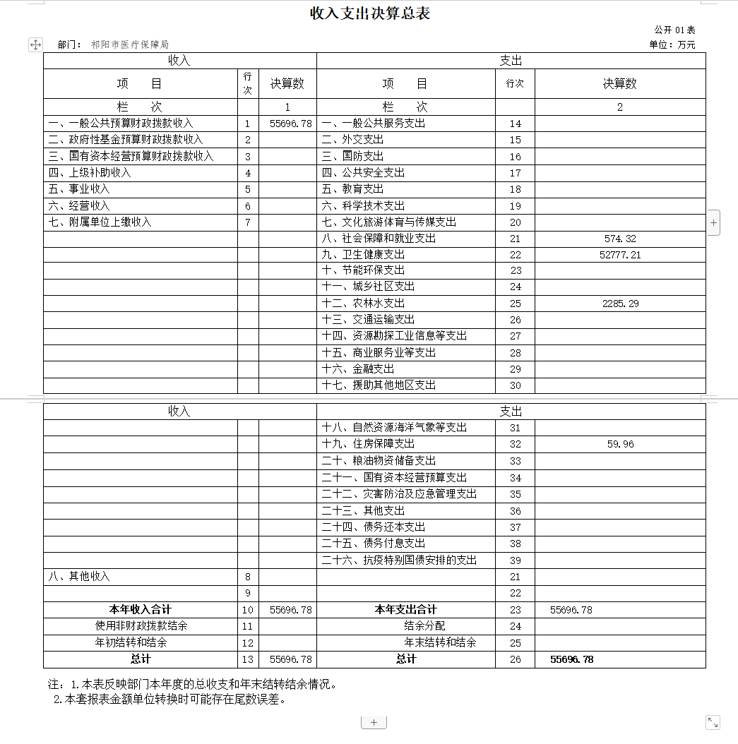 2021年度收、支总计55696.78万元。与上年相比,增加4410.4万元,增长8.5%,主要是因为财政对卫生健康支出投入的增加