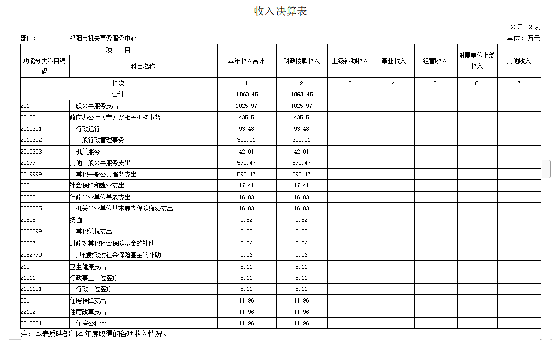 2021年度收入合计1063.45万元,其中:财政拨款收入1063.45万元,占100%;上级补助收入0万元,占0%;事业收入0万元,占0%;经营收入0万元,占0%;附属单位上缴收入0万元,占0%;其他收入0万元,占0%。