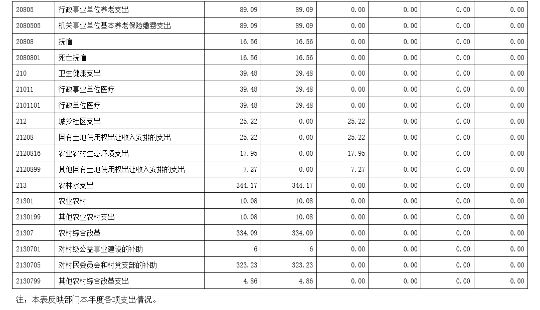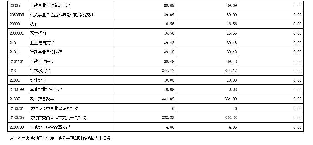 年初预算为0万元,支出决算为323.23万元,决算数大于年初预算数的主要原因是:对村民委员会和村党支部的补助支出未纳入年初预算,为本年度财政追加。