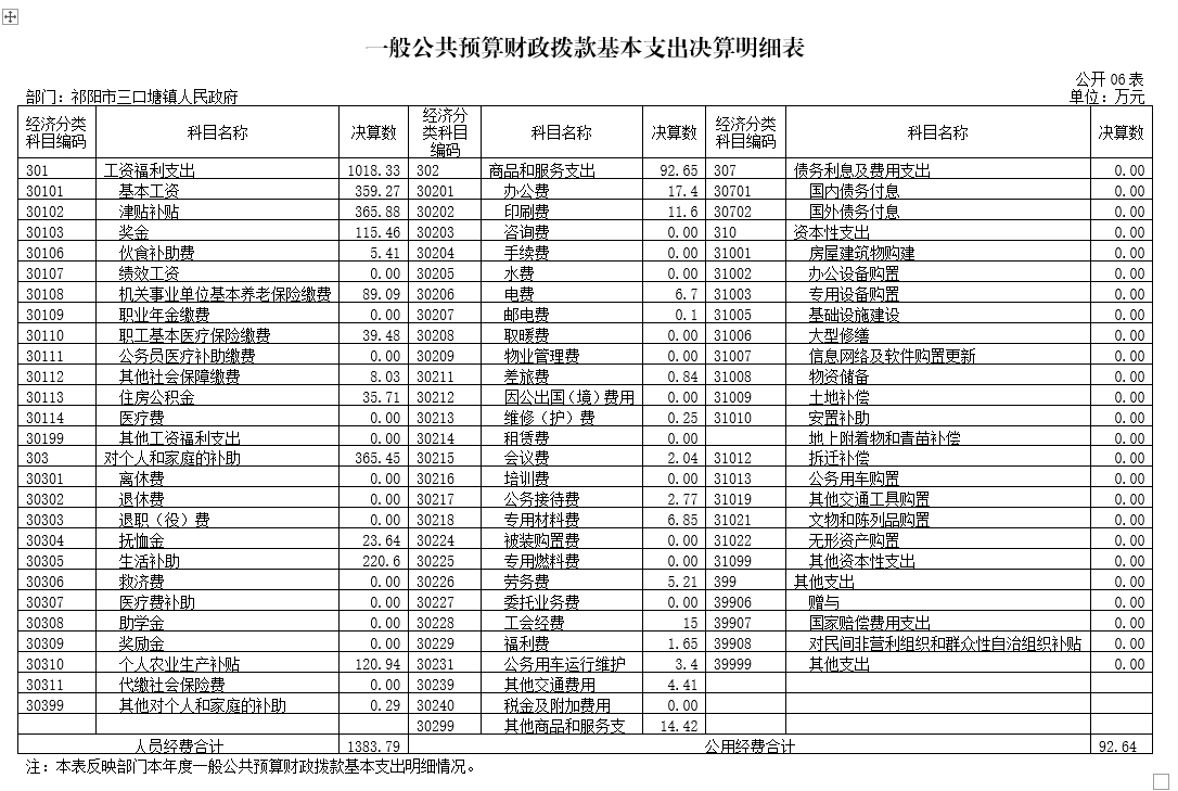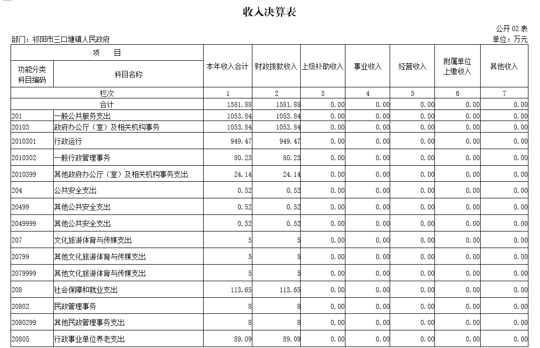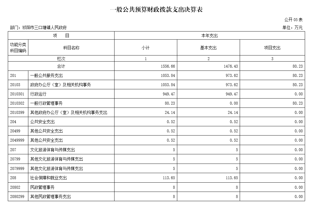 2023年祁阳市三口塘镇人民政府本级总收入1581.88万元,总支出共计1581.88万元,其中基本支出1476.43万元,项目支出105.45万元。本年度无重点项目支出。