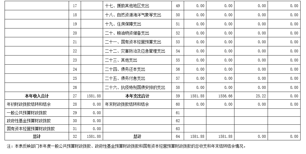2023年度收入合计1581.88万元,其中:财政拨款收入1581.88万元,占100%;上级补助收入0万元,占0%;事业收入0万元,占0%;经营收入0万元,占0%;附属单位上缴收入0万元,占0%;其他收入0万元,占0%。