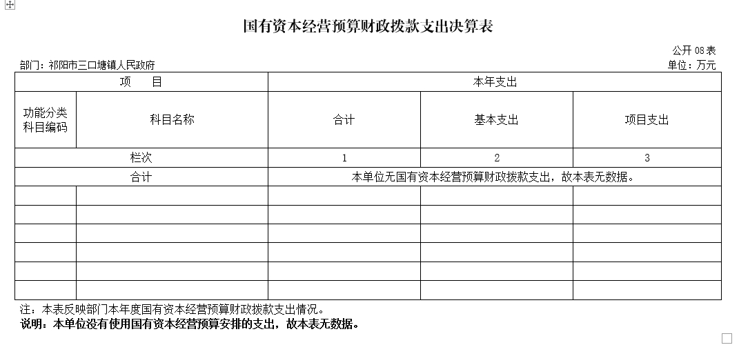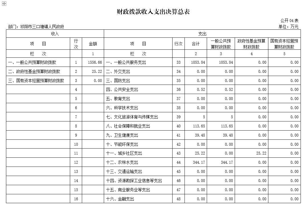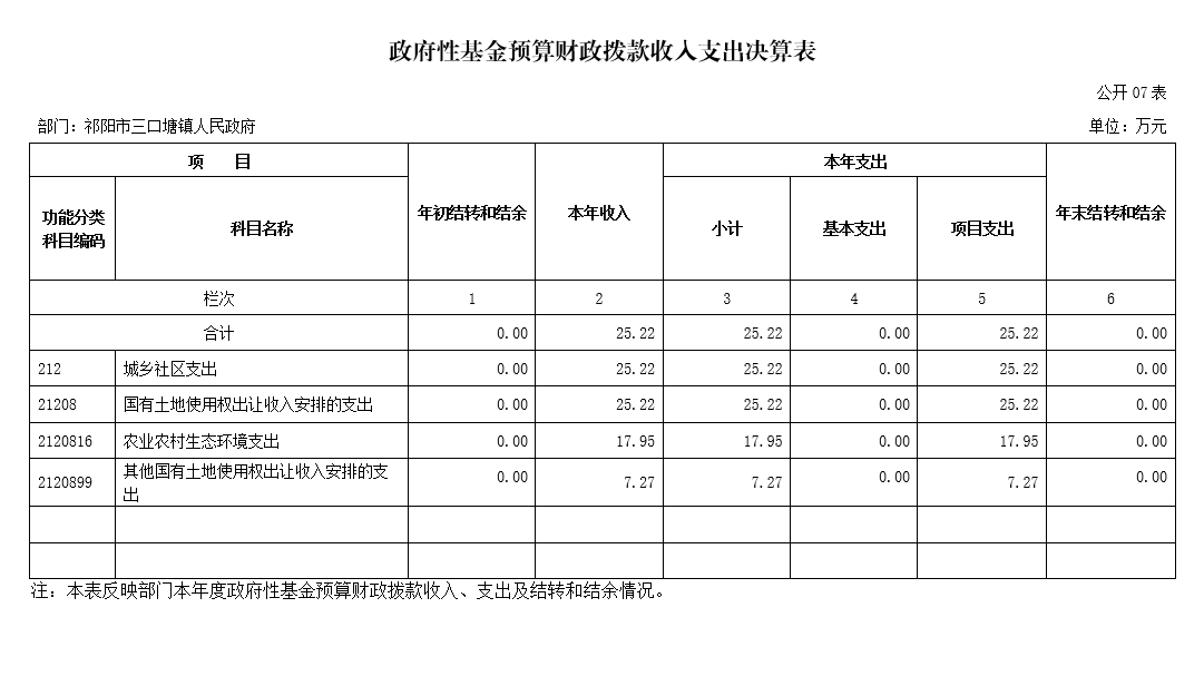 政府性基金预算财政拨款收入25.22万元;年初结转和结余0万元;支出25.22万元,其中基本支出0万元,项目支出25.22万元;项目支出核算主要用于三口塘镇人民政府的环境整治方面,年末结转和结余0万元。