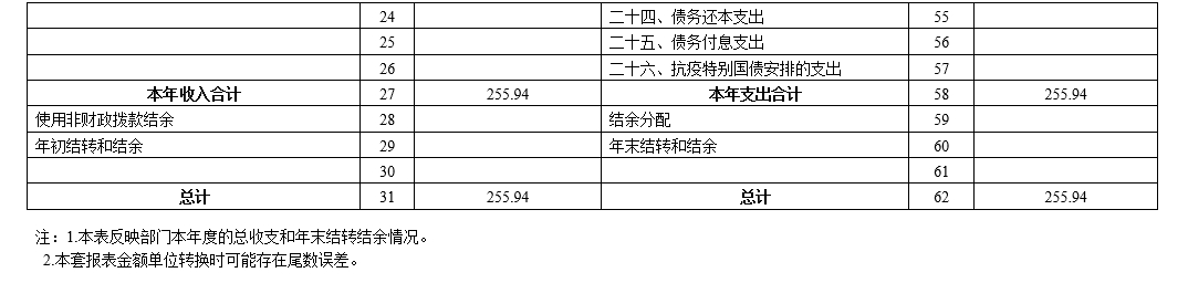 2023年度收、支总计255.94万元。与上年相比,减少22.16万元,减少7.97%,主要是因为本年度在职人员比上年度减少,经费也相应减少。