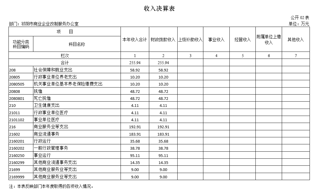 2023年度收入合计255.94万元,其中:财政拨款收入255.94万元,占100%;上级补助收入0万元,占0%;事业收入0万元,占0%;经营收入0万元,占0%;附属单位上缴收入0万元,占0%;其他收入0万元,占0%。