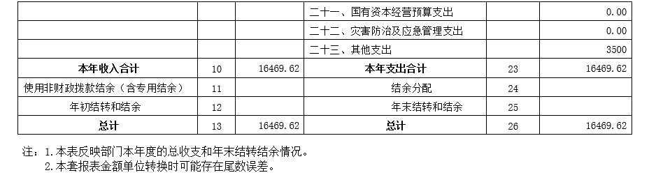 2023年度收入合计16469.62万元,其中:财政拨款收入16469.62万元,占100%;上级补助收入0万元,占0%;事业收入0万元,占0%;经营收入0万元,占0%;附属单位上缴收入0万元,占0%;其他收入0万元,占0%。