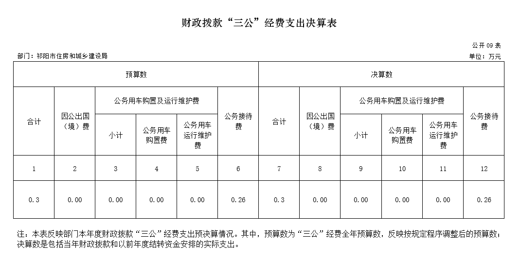 2023年度“三公”经费财政拨款支出决算中,公务接待费支出决算0.26万元,因公出国(境)费支出决算0万元,占0%,公务用车购置费及运行维护费支出决算0万元,占0%。其中: