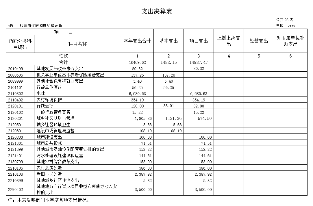 2023年度支出合计16469.62万元,其中:基本支出1482.15万元,占8.99%;项目支出14987.47万元,占91%;上缴上级支出0万元,占0%;经营支出0万元,占0%;对附属单位补助支出0万元,占0%。