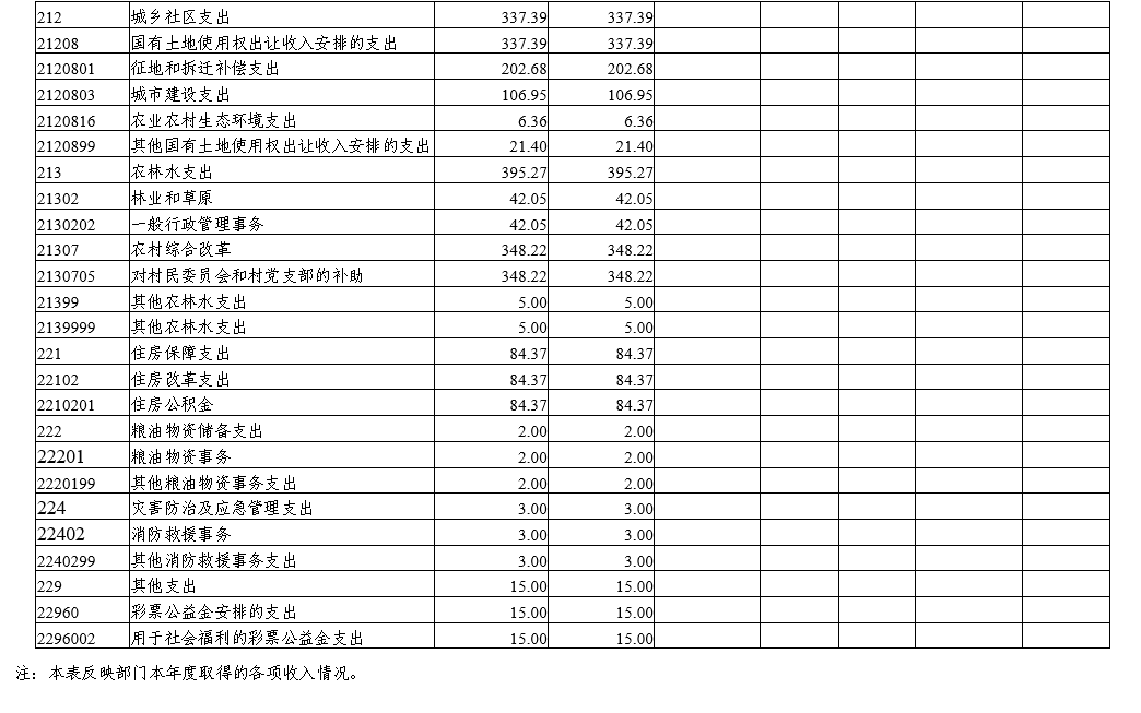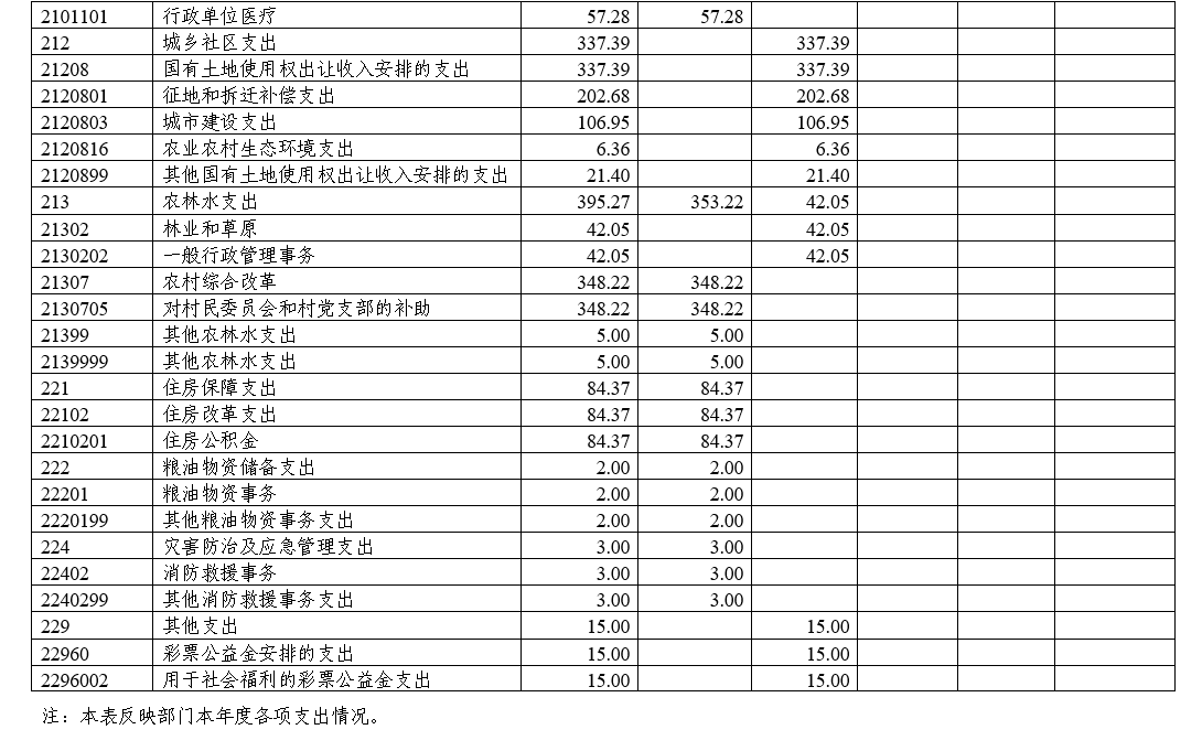 3、政府性基金预算财政拨款项目支出为352.39万元,占财政拨款总支出14.74%。主要项目有:城乡社区支出(212)国有土地使用权出让收入安排的支出(21208)征地和拆迁补偿(2120801)支出3202.68万元、城乡社区支出(212)国有土地使用权出让收入安排的支出(21208)城市建设(2120803)支出106.95万元、城乡社区支出(212)国有土地使用权出让收入安排的支出(21208)农业农村生态环境(2120816)支出6.36万元、城乡社区支出(212)国有土地使用权出让收入安排的支出(21208)其他国有土地使用权出让收入安排的支出(2120899)支出21.40万元、其他支出(229)彩票公益金安排的支出(22960)用于社会福利的彩票公益金支出(2296002)支出15.00万元。