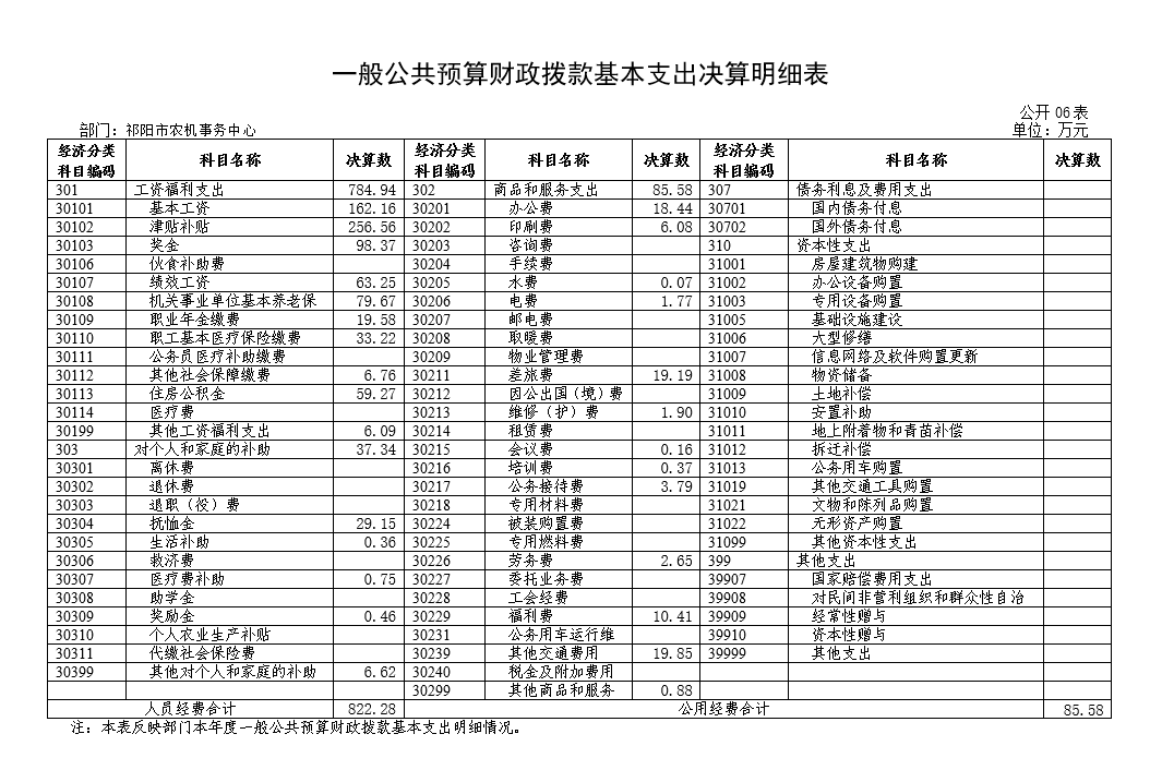 2024年基本支出907.85万元,其中:(1)工资福利支出784.94万元,包括基本工资、津贴补贴、奖金、社会保障缴费、伙食补助费、绩效工资、其他工资福利支出;(2)商品和服务支出85.57万元,包括办公费、印刷费、咨询费、手续费、水费、电费、邮电费、取暖费、物业管理费、差旅费、因公出国(境)费、维修(护)费、租赁费、会议费、培训费、公务接待费、专用材料费、劳务费、委托业务费、工会经费、福利费、公务用车运行维护费、其他交通费、其他商品和服务支出;(3)对个人和家庭补助支出37.34万元,包括离休费、退休费、抚恤金、生活补助、医疗费、助学金、奖励金、住房公积金、提租补贴、其他对个人和家庭的补助支出。预算执行基本围绕保人员经费、保正常运转进行。从决算情况看,基本支出比重比较大。特别是国家政策调整,取消了农机部门的收费权限,2016年4月2日财政部和国家发改委关于扩大免征范围的18项行政事业性收费中,涉及农机监理的有5项,这项政策的减收,使本就经费紧张的农机事务中心更是雪上加霜。在创卫、创文、党建、扶贫等中心工作上我中心认真执行市委、市政府的统一安排和部署,不打折扣的投入大量的人力、物力、财力的大力投入。“三公经费”支出3.793万元,比上年略有下降。以上各种原因,基本保障面临很大的压力。