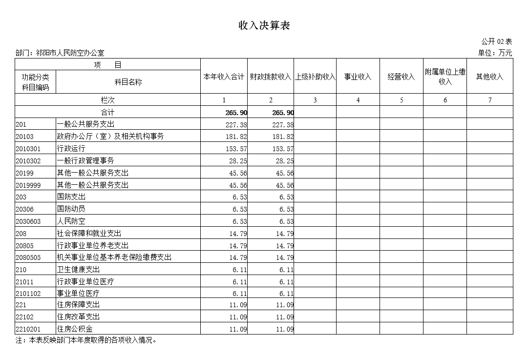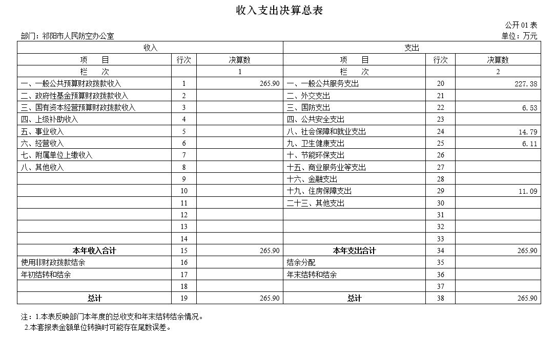 2024年度收、支总计265.90万元。与上年相比,减少61.29万元,减少18.73%,主要是因为人防项目资金完成。