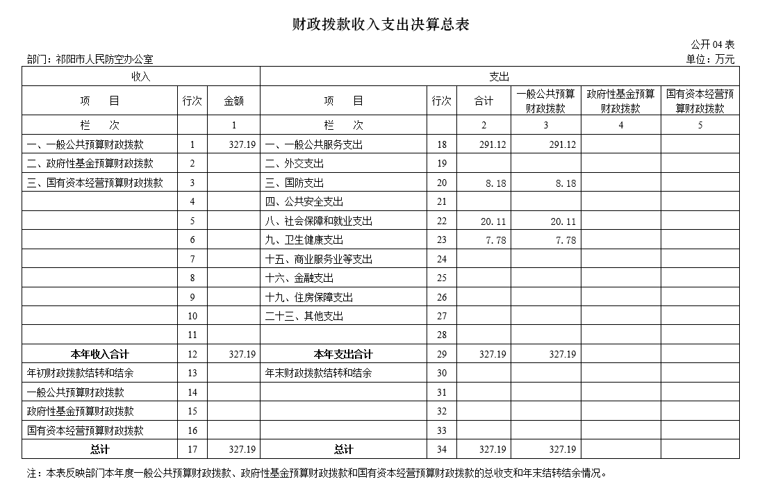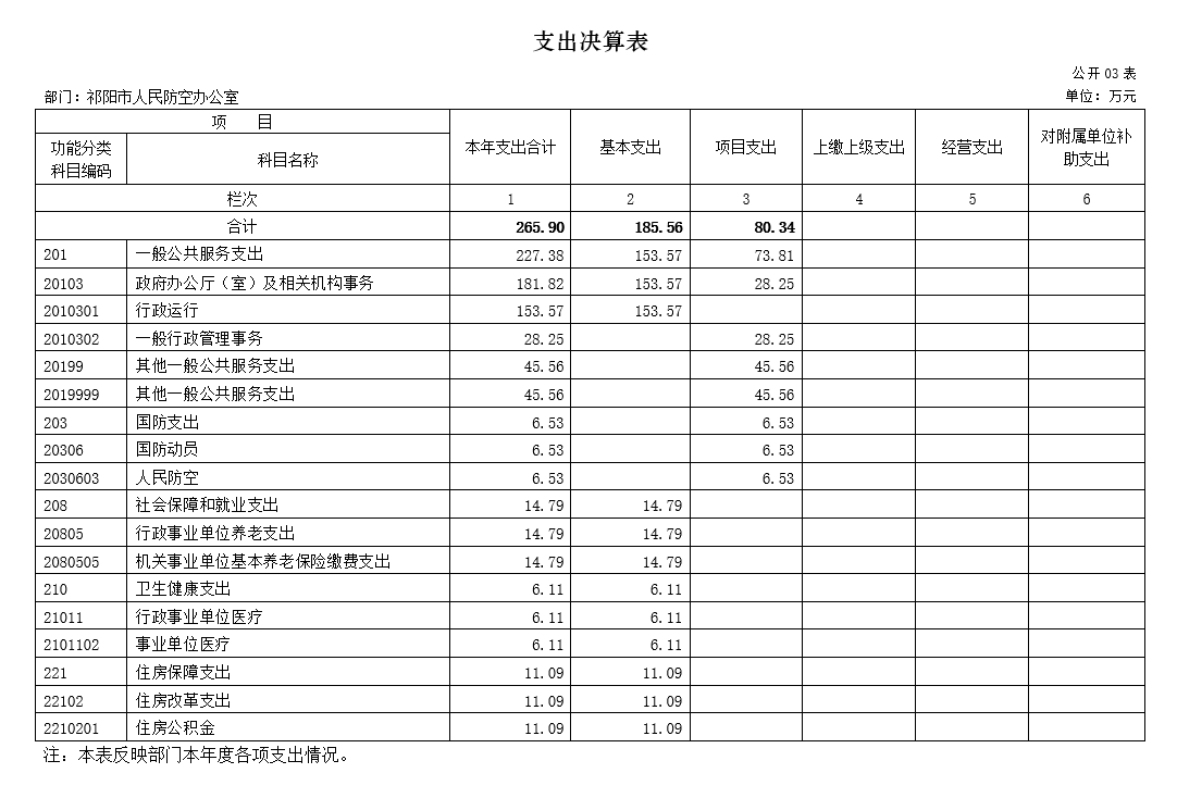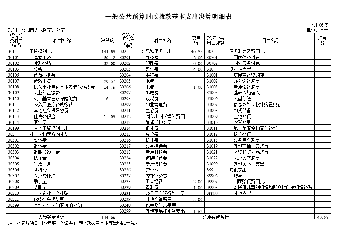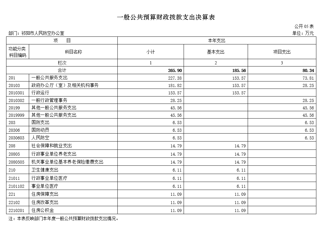 1.预算编制情况。严格按照预算管理的相关规定和市级部门预算编制要求, 科学合理编制次年项目预算,按时完成了2024年预算编制工作。2024年祁阳市人民防空办公室收入预算总额为265.90万元,其中:当年财政拨款收入265.90万元。相应安排支出预算265.90万元,其中:人员支出144.69万元,日常公用支出40.87万元,对个人和家庭的补助支出0万元,专项支出0万元。