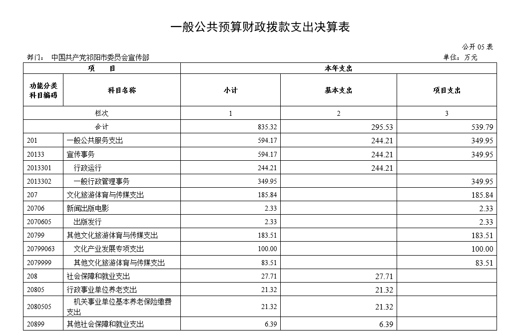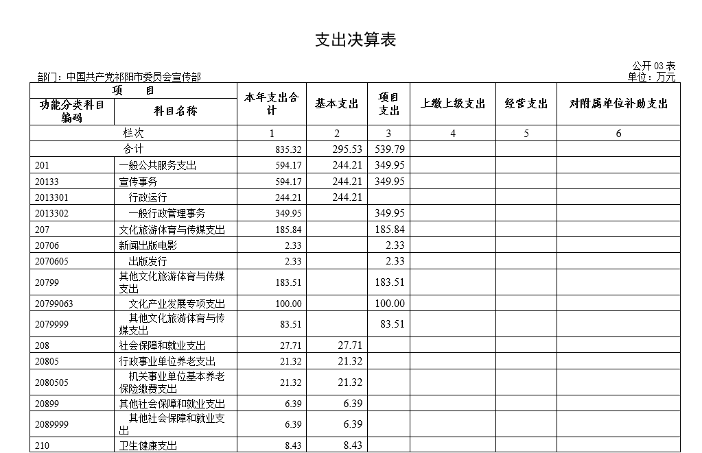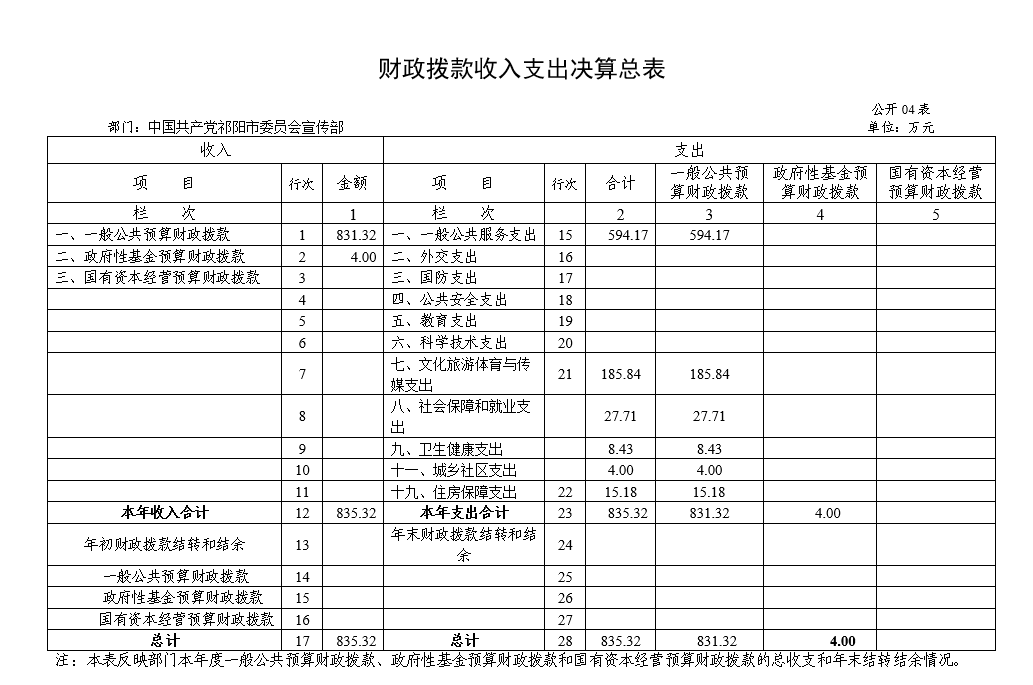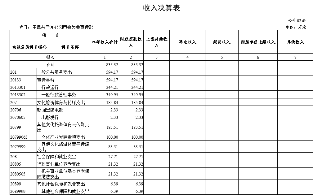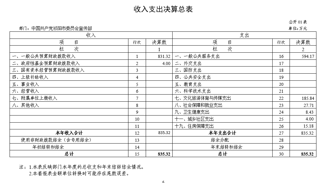 2024年度收、支总计835.32万元。与上年相比,减少353.8万元,减少29.75%,主要是因为减少了全市2020年-2021年“十星级”文明户、示范户奖励及《中国共产党宣传工作简史》等九部图书部分发行经费。