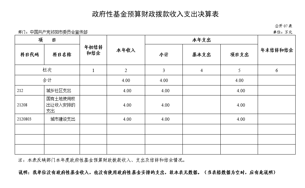 2024年度政府性基金预算财政拨款收入4.00万元;年初结转和结余0万元;支出4.00万元,其中基本支出0万元,项目支出4.00万元;年末结转和结余0万元。具体情况如下: