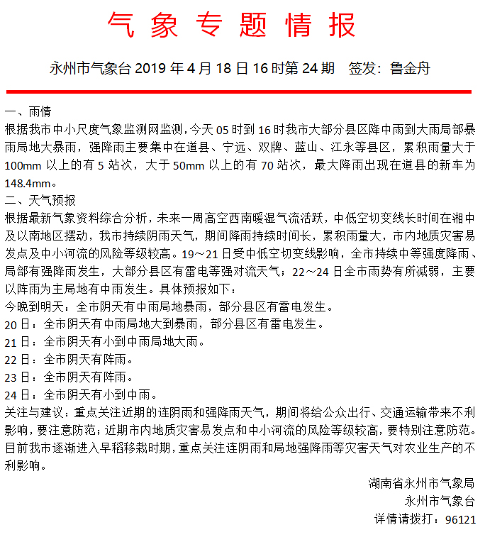 气象专题情报永州市气象台2019年4月18日16时第24期 (2019-04-19)