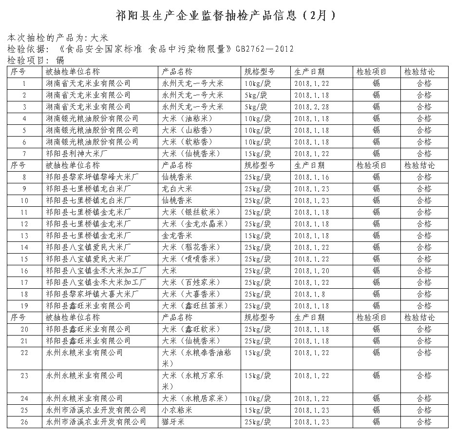 祁阳县2月份生产企业监督抽检产品信息(大米)