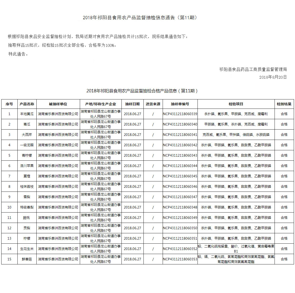 2018年祁阳县食用农产品监督抽检信息通告(第11期)