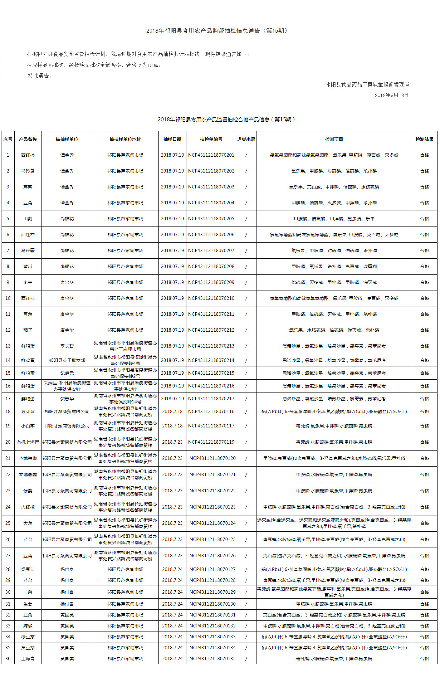 2018年祁阳县食用农产品监督抽检信息通告(第15期)