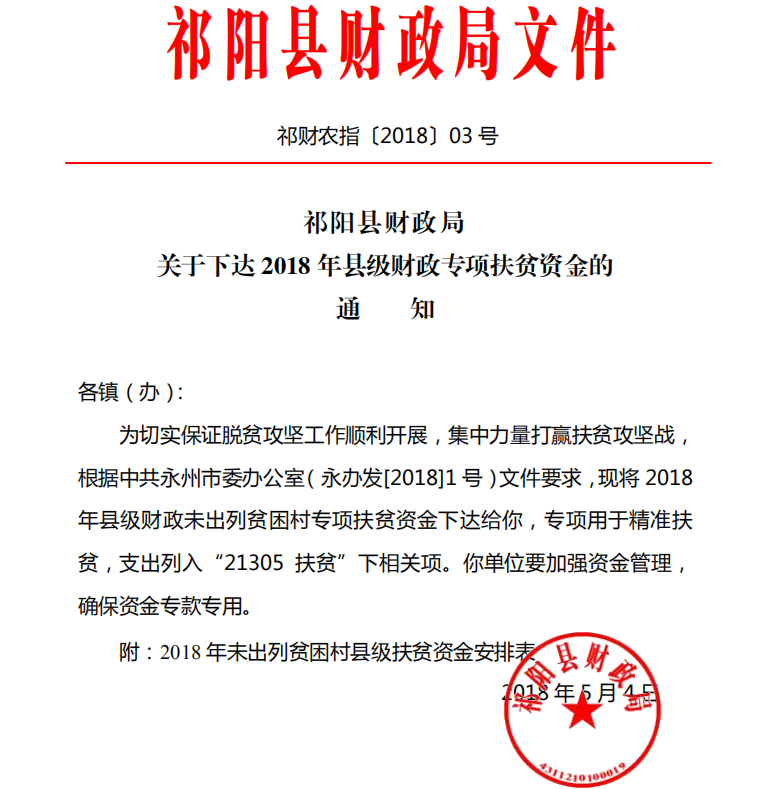 祁阳县财政局关于下达2018年县级财政专项扶贫资金的通知