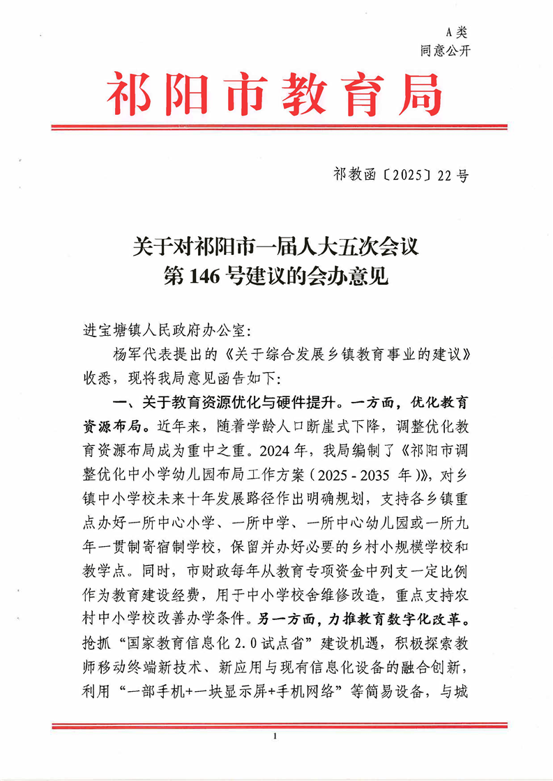 祁教函[2025]22号 关于对祁阳市一届人大五次会议第146号建议的会办意见