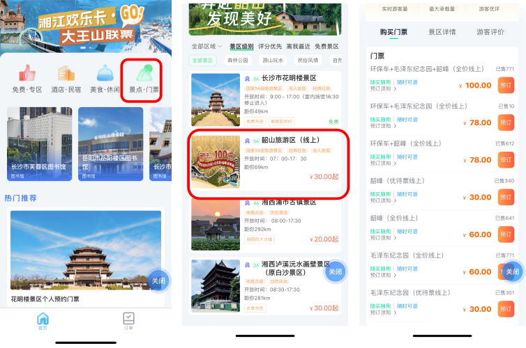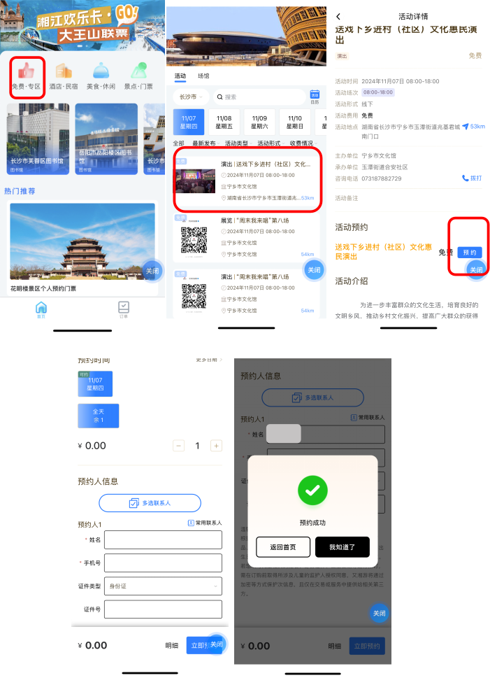 “湘易办”超级服务端(以下简称“湘易办”)新上线“惠民文旅”专区,旨在为广大用户提供更加丰富、便捷的文旅服务。专区包含查询、预约免费活动和场馆、购买景区门票、预定酒店民宿等服务功能,可为游客用户节省排队时间,让旅行更轻松便捷!