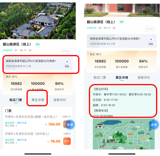 选择 “景点・门票” ,进入后可查询并购买景区门票。还可查询景区距离以及景区详情。