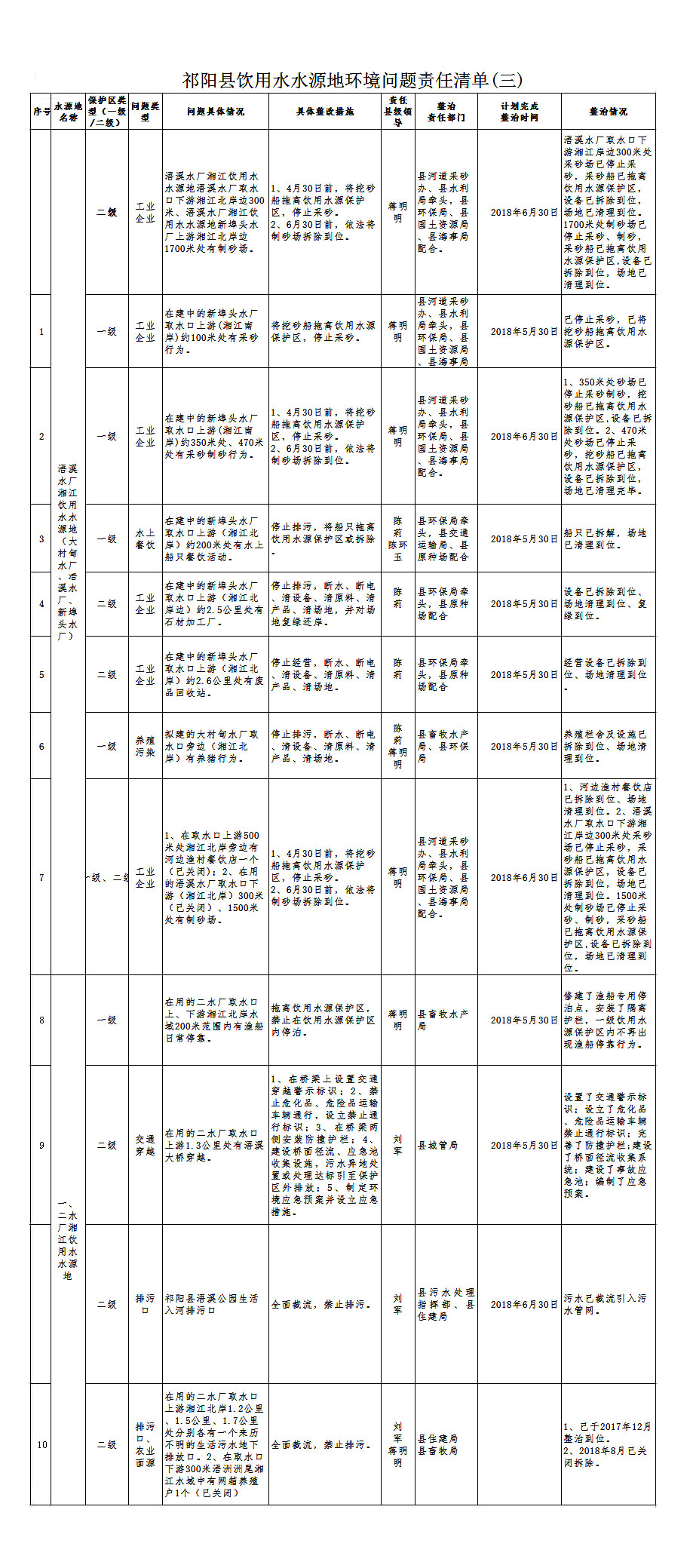 祁阳县县级饮用水水源地环境问题责任清单及整治情况(三)