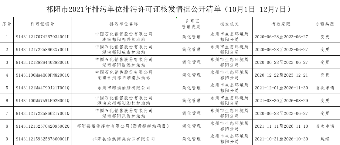 祁阳市2021年排污单位排污许可证核发情况公开清单