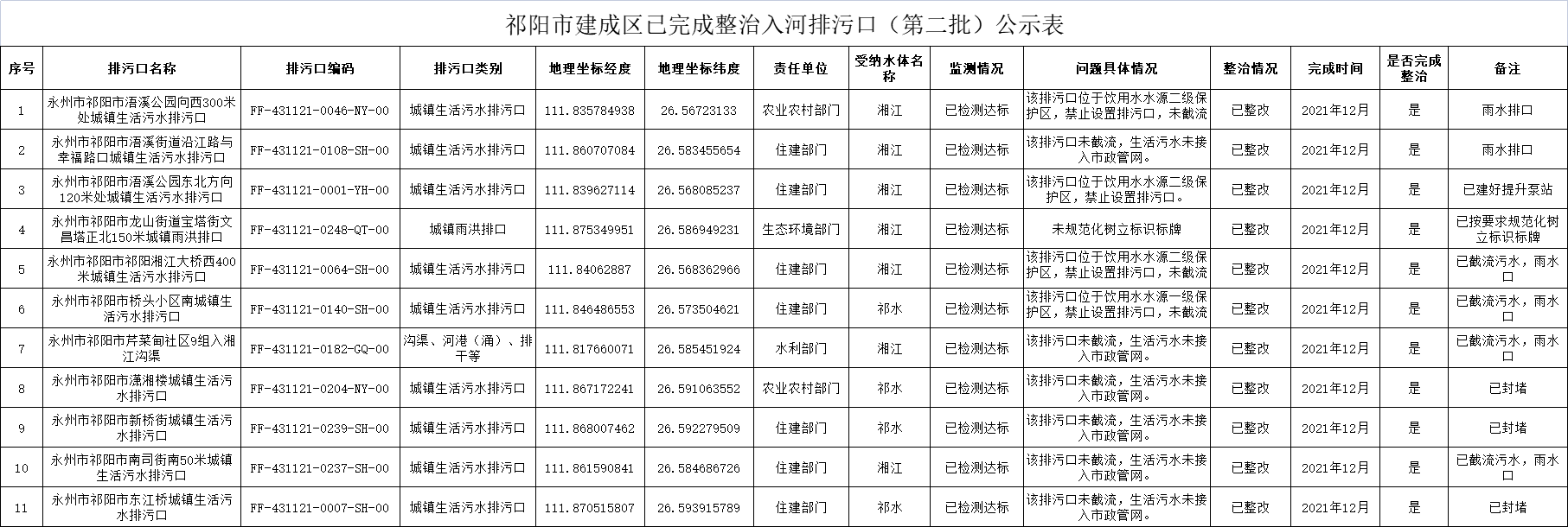 关于祁阳市建城区已完成整治入河排污口(第二批)的公示
