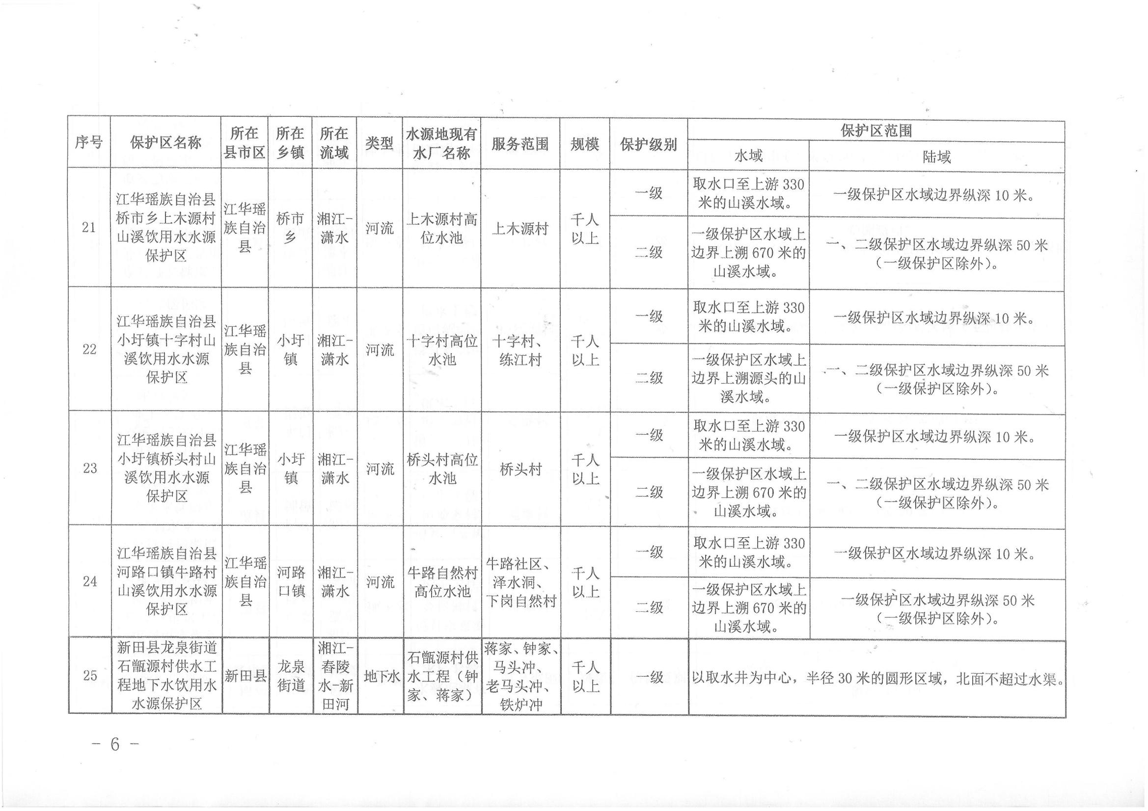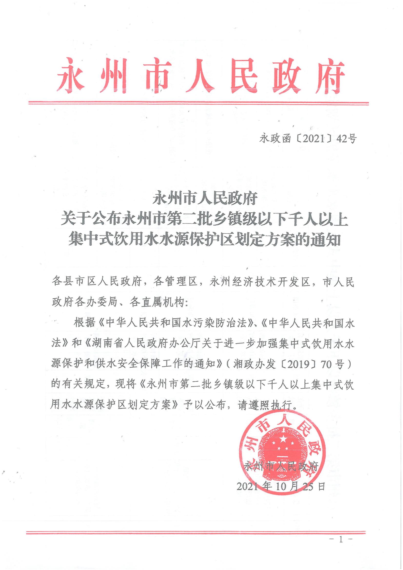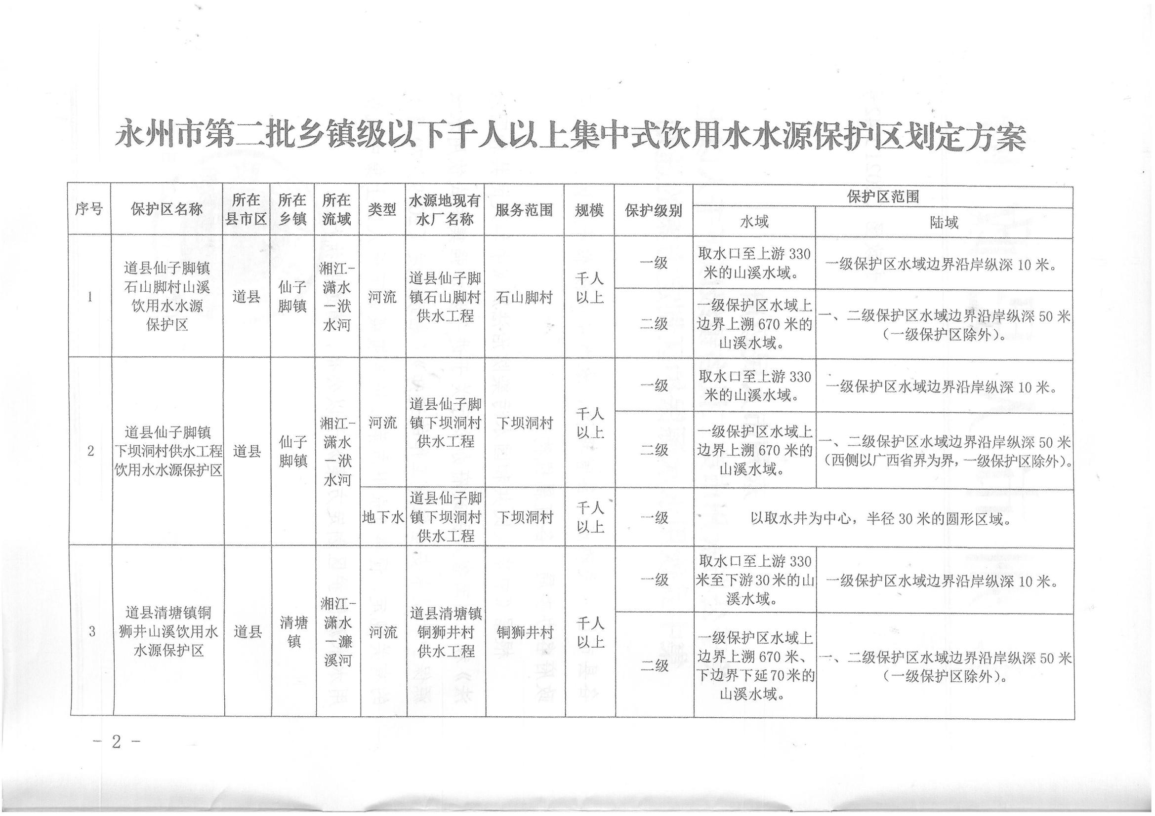 永州市人民政府 关于公布永州市第二批乡镇级以下千人以上集中式饮用水水源保护区划定方案的通知
